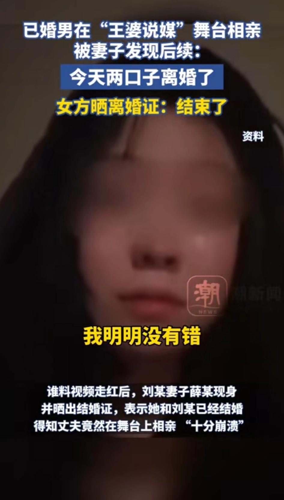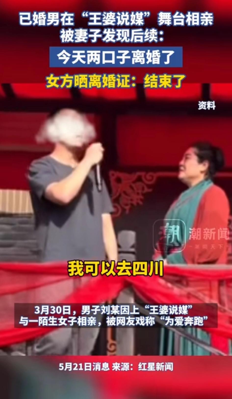 已婚男在“王婆说媒”舞台相亲被妻子发现后后续:今天两口子离婚。 3月30日,已婚男刘某跑上“王婆说媒”舞台相亲,视频走红后,妻子薛某现身晒结婚证,称“十分崩溃”。原来他俩是青梅竹马,薛某留学日本,出国前为给男方保障,两人偷偷领了证,还商量好四月回国、年底订婚、明年办婚礼。 典型的下头男,已婚身份还上去征婚,视频爆出来,还想用妻子账号借机炒作以此谋利。 现在好了离婚了,借此事女方也认清男人的嘴脸。 5月21日消息,薛某回国50多天,一个月前登记离婚,过了冷静期,正式离了。 薛某一开始愿意和解,可刘某想靠她的自媒体号养自己,不想工作,她接受不了。 而且刘某家对她回国也没任何表态,这婚离得也算有迹可循了。