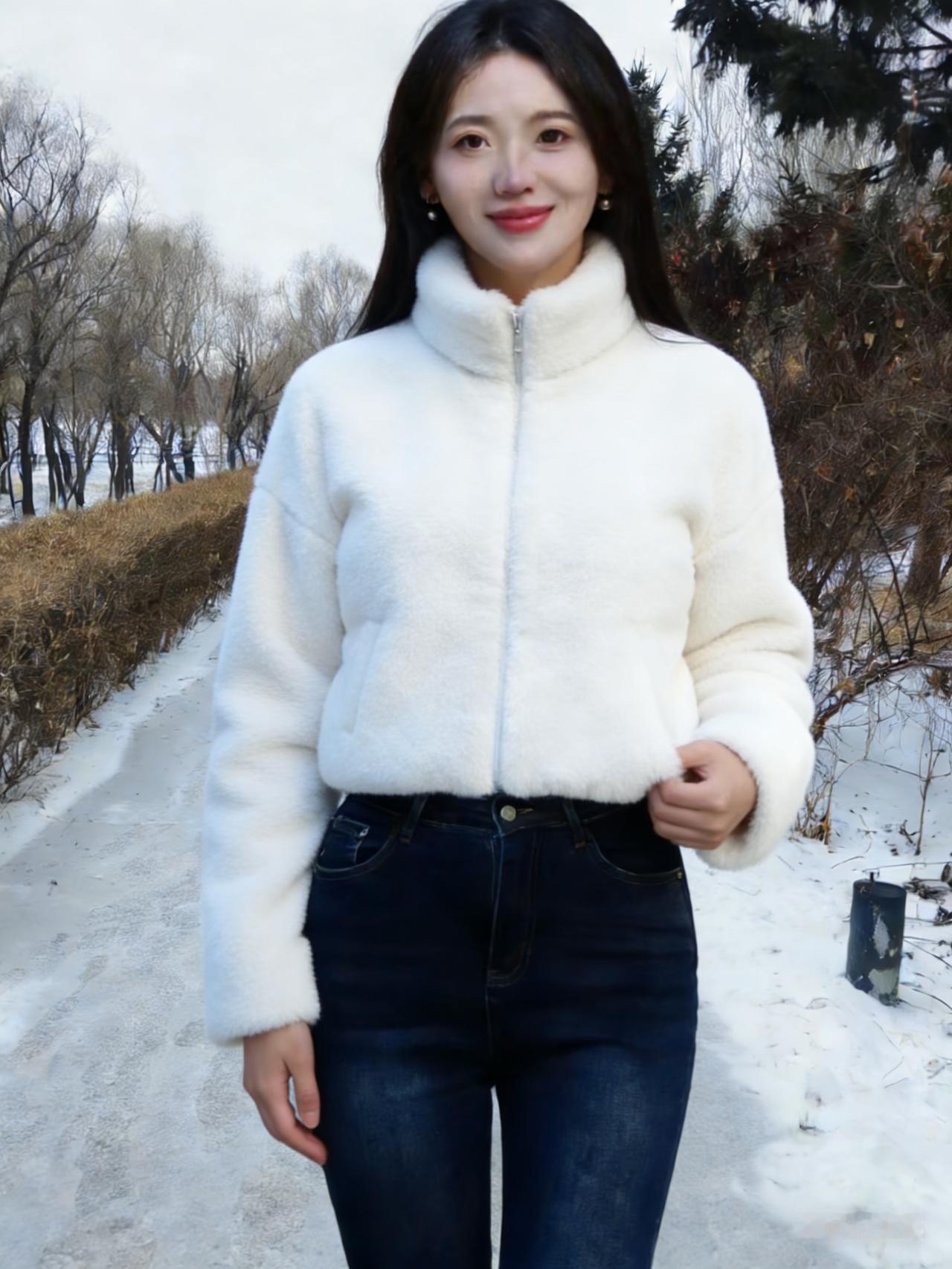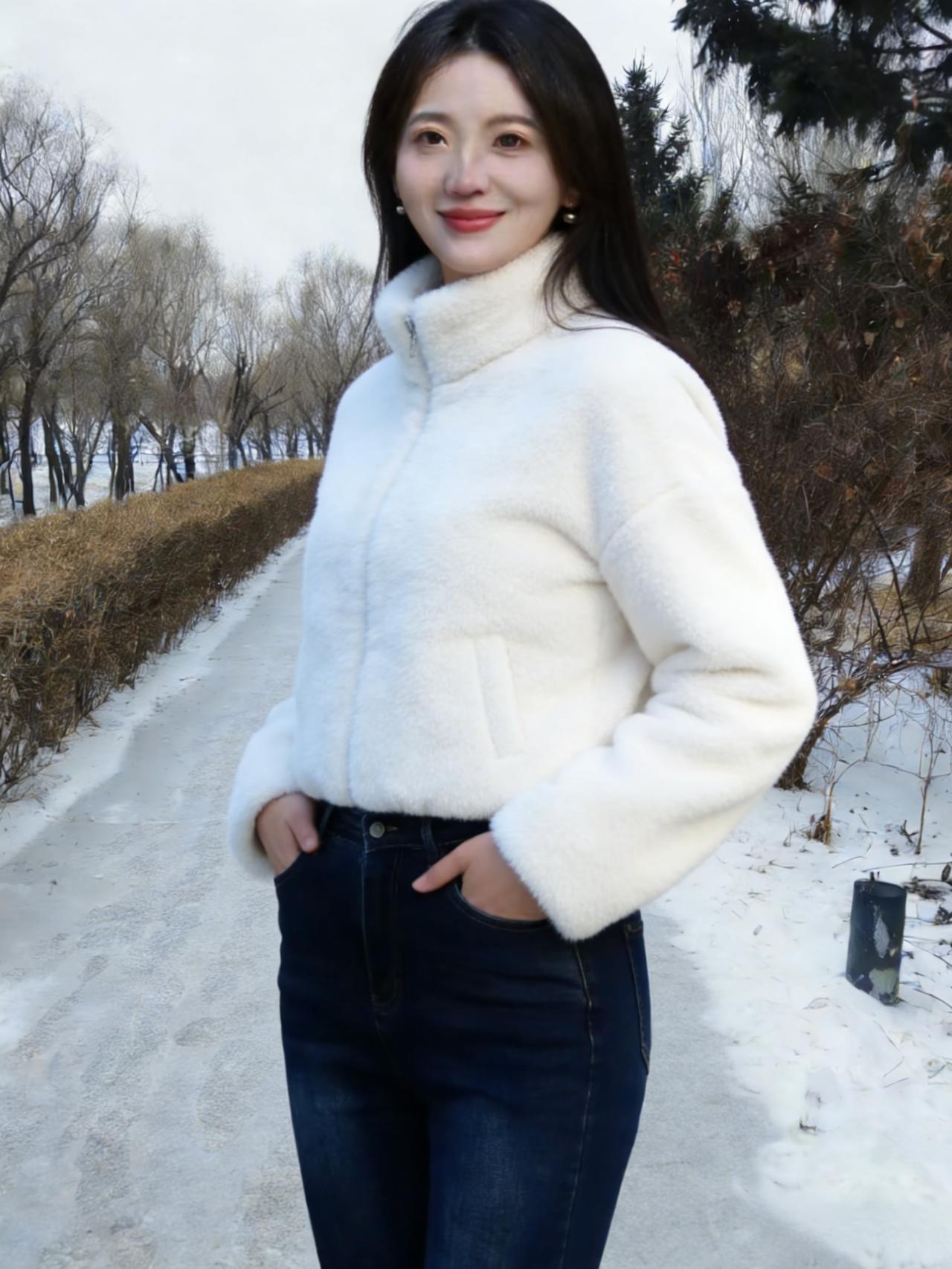 一袭针织衬娉婷,牛仔裁风步履轻。 皮袄斜簪云鬓俏,羽衣微拢楚腰盈。 踏残陌上三秋