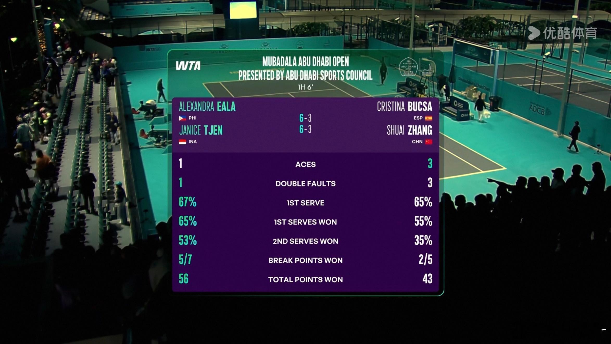 WTA500阿布扎比站双打1/4决赛,2号种子张帅/布克沙连丢两盘3-6/3-6不敌伊埃拉/曾丽美,止步八强,新赛季女双11连胜遗憾终结。