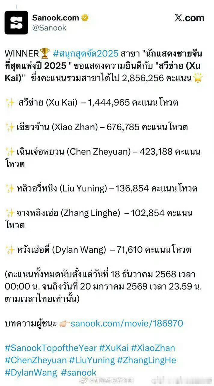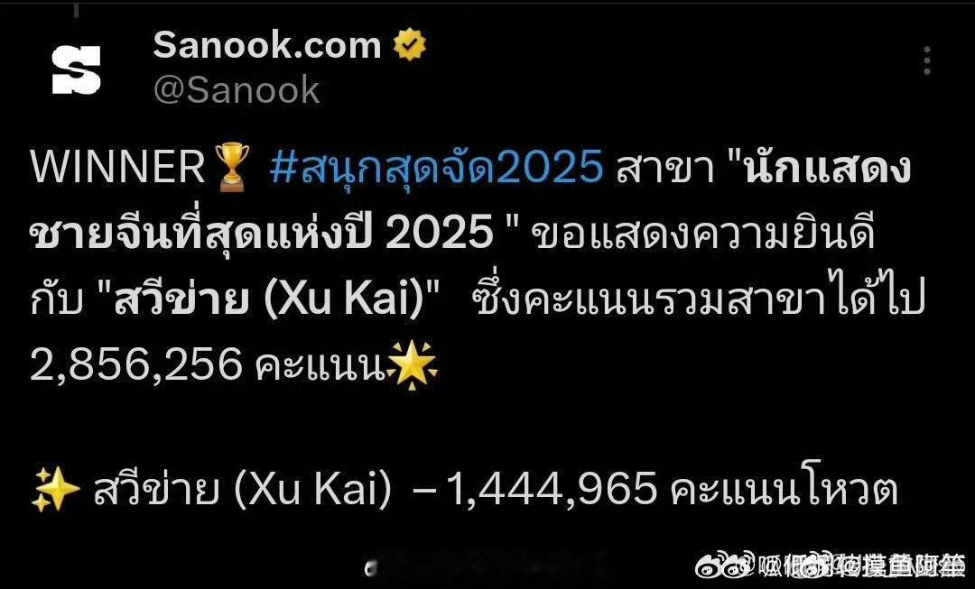 许凯获得泰国Sanook年度巅峰之选2025举办“2025年度最佳中国男演员”投票第一名!2025很多作品都在国外播出积累了很多的海外人气,恭喜!🎉