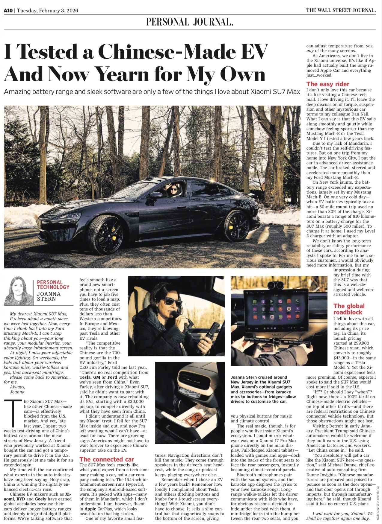 《华尔街日报》的科技专栏作者 Joanna Stern 开了两周小米SU7 MAX后,对驾驶体验和智能生态赞不绝口,觉得SU7 Max开起来就是大家想象中科技公司造车该有的样子,而不是传统汽车公司硬加科技的感觉