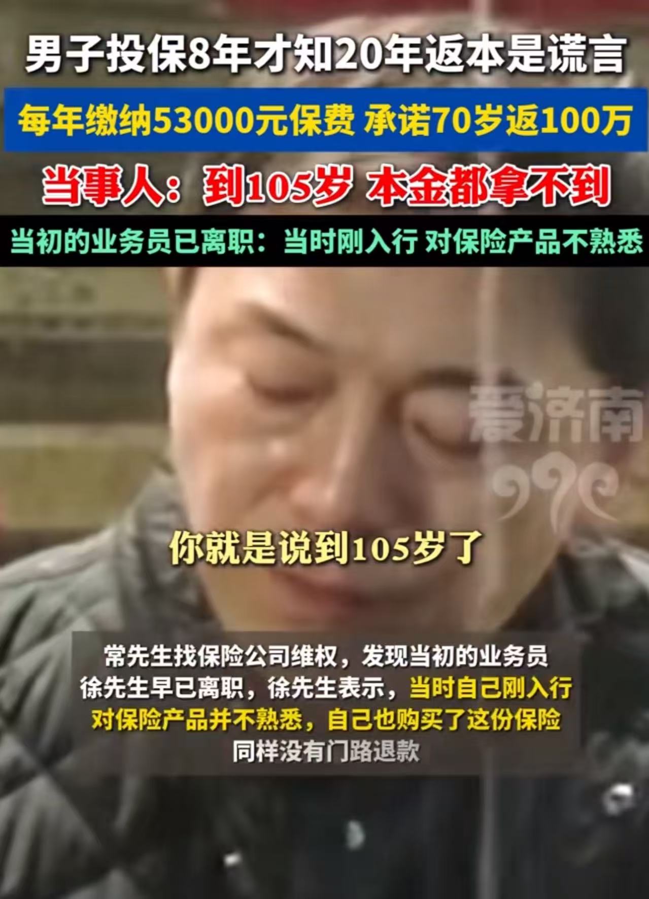 男子每年缴纳53000元保费,投保8年才知道20年返本是谎言!男子:“就算我活到105岁,连本金都拿不到!”当初的业务员:“已经离职,当时刚入行,对保险产品不熟悉。”网友:本来买保险是图保障,结果跟诈骗一样!