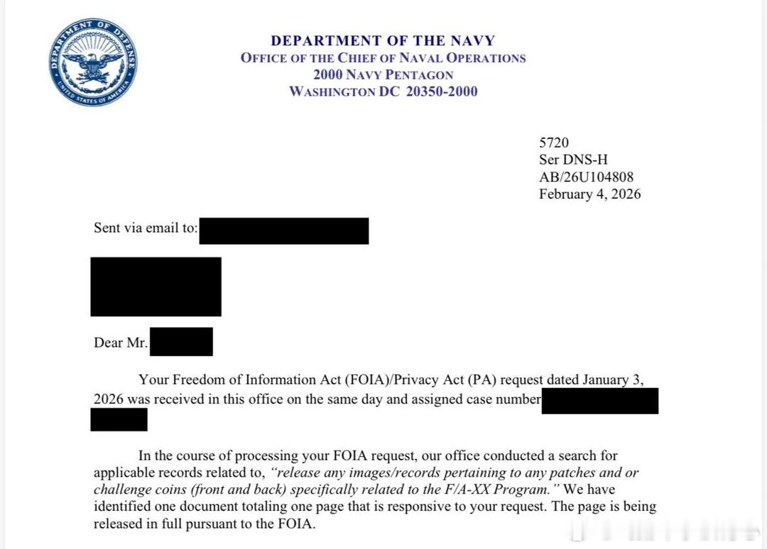 图片一翻译(大概):您于2026年1月3日提交的《信息自由法》(FOIA)/《隐私法》(PA)申请已于当日送达本办公室,并分配了案件编号。在处理您的FOIA申请过程中,本办公室检索了与“公开与FlA-XX项目相关的任何徽章和/或挑战币(正反面)的图像/记录”相关的适用记录。我们已找到一份共一页的文件符合您的申请要求。根据FOIA,现将该页文件全文公开。