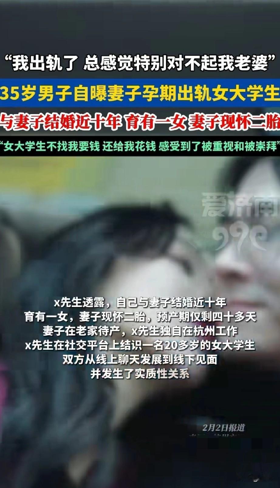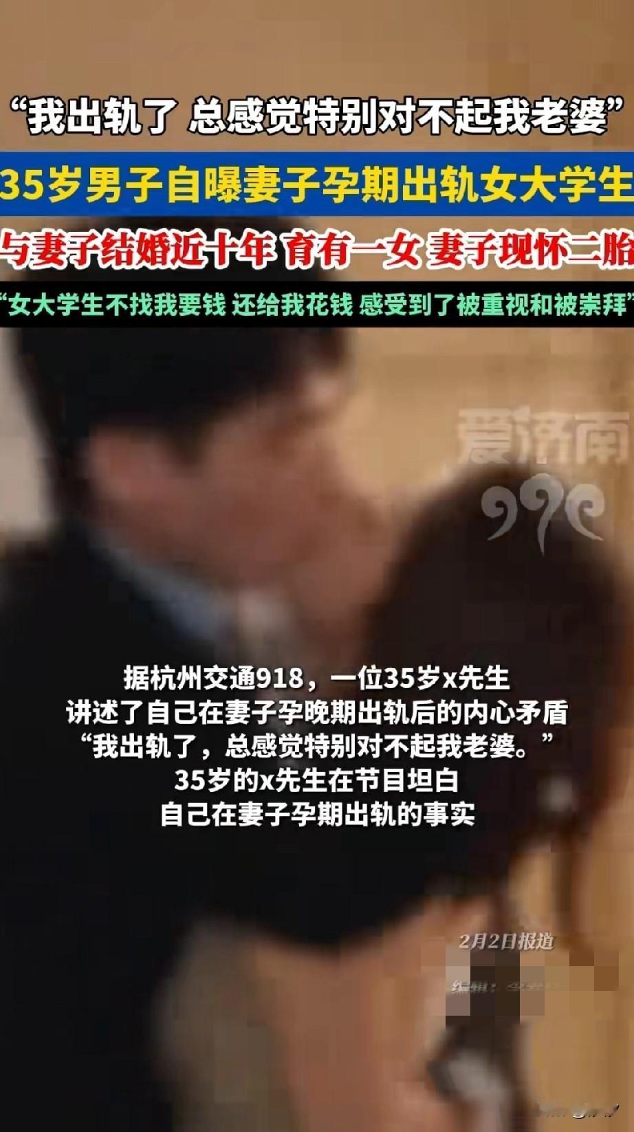 我出轨了,总感觉特别对不起我老婆!一名35岁的男士讲述了自己出轨的事实! 他的妻子在老家待产,他一个人在杭州工作生活,妻子怀孕期间,他在线上聊了一个20岁的女大学生! 很快,两个人从线上聊到了线下,并且在酒店发生了关系,这名女大学生对她非常好! 还把奖学金花在了他身上,但不给他要钱,还给他钱花,这让他感觉到了自己被尊重和被崇拜! 妻子给他打电话总是围绕前经济和心理压力,这样他不得不找女大学生放纵自己,他的妻子还有三四十天就生了,没想到自己的老公会出轨! 她和老公结婚10年了,两人生下一个女儿,如今又怀了第二胎,她实在想不明白自己的老公为什么这样做! 平时那个看着上进又老实的老公,居然还会去找女大学生,这让两个人的感情出现了危机! 女学生不知道他有妻子,他的老婆知道这件事后对他哭闹不已,让他难以决断,心乱如麻! 这名男子也是觉得心里对不起自己的老婆和女大学生,但是他确实,做了这事,这让他感到了深深的自责! 既然有家庭,就要以家庭为主,更不应该出去沾花惹草,这是一个男人对家庭的守护,更是一个做父亲应该有的觉悟! 大家对于35岁男子找女大学生出轨这事怎么看?不妨聊一聊! 婚姻 出轨丈夫出轨 伴侣出轨 出轨男人 男子的出轨