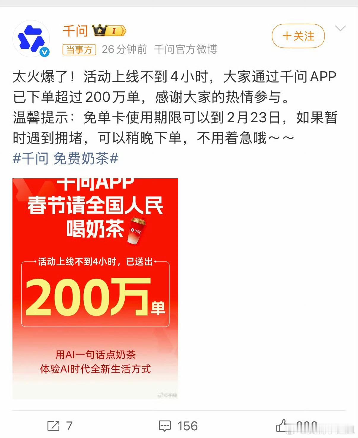 千问回应免费奶茶活动更符合中国宝宝体质的AI大战
