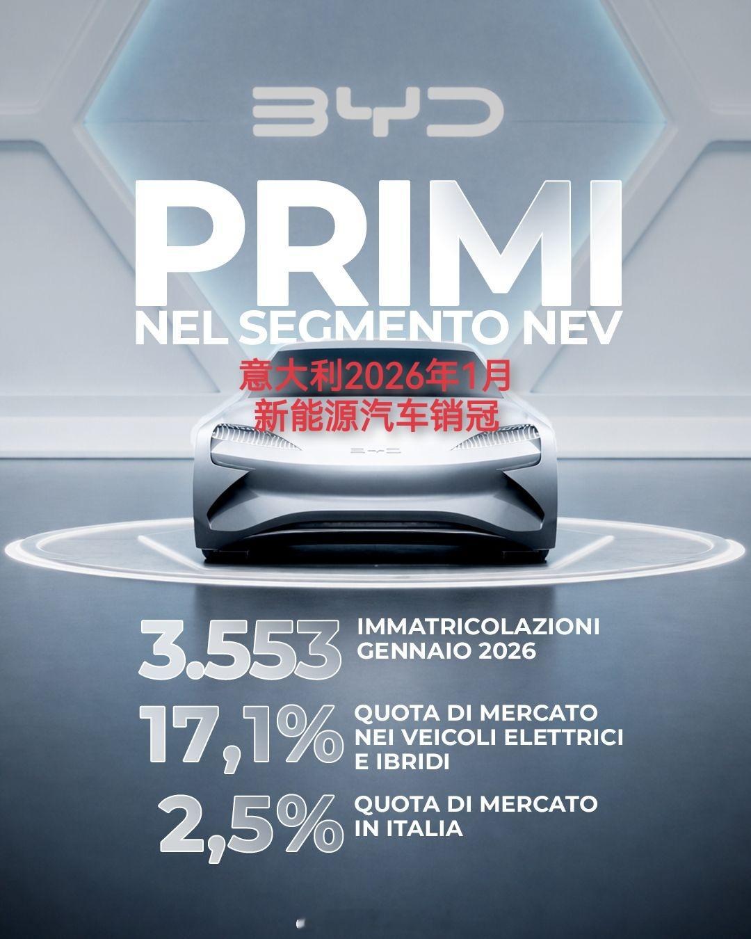 2026年1月,比亚迪宋PLUS和海豹06分获意大利B级SUV和B级轿车销冠!