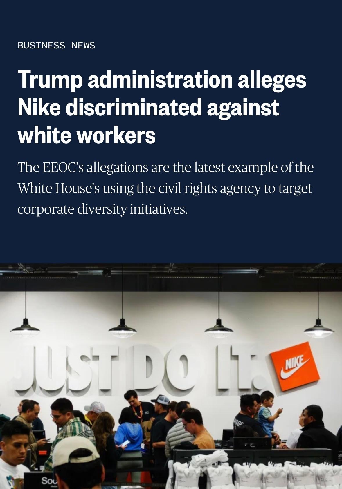 美国平等就业机会委员会对耐克公司展开调查,指控其DEI政策可能导致对白人员工的歧