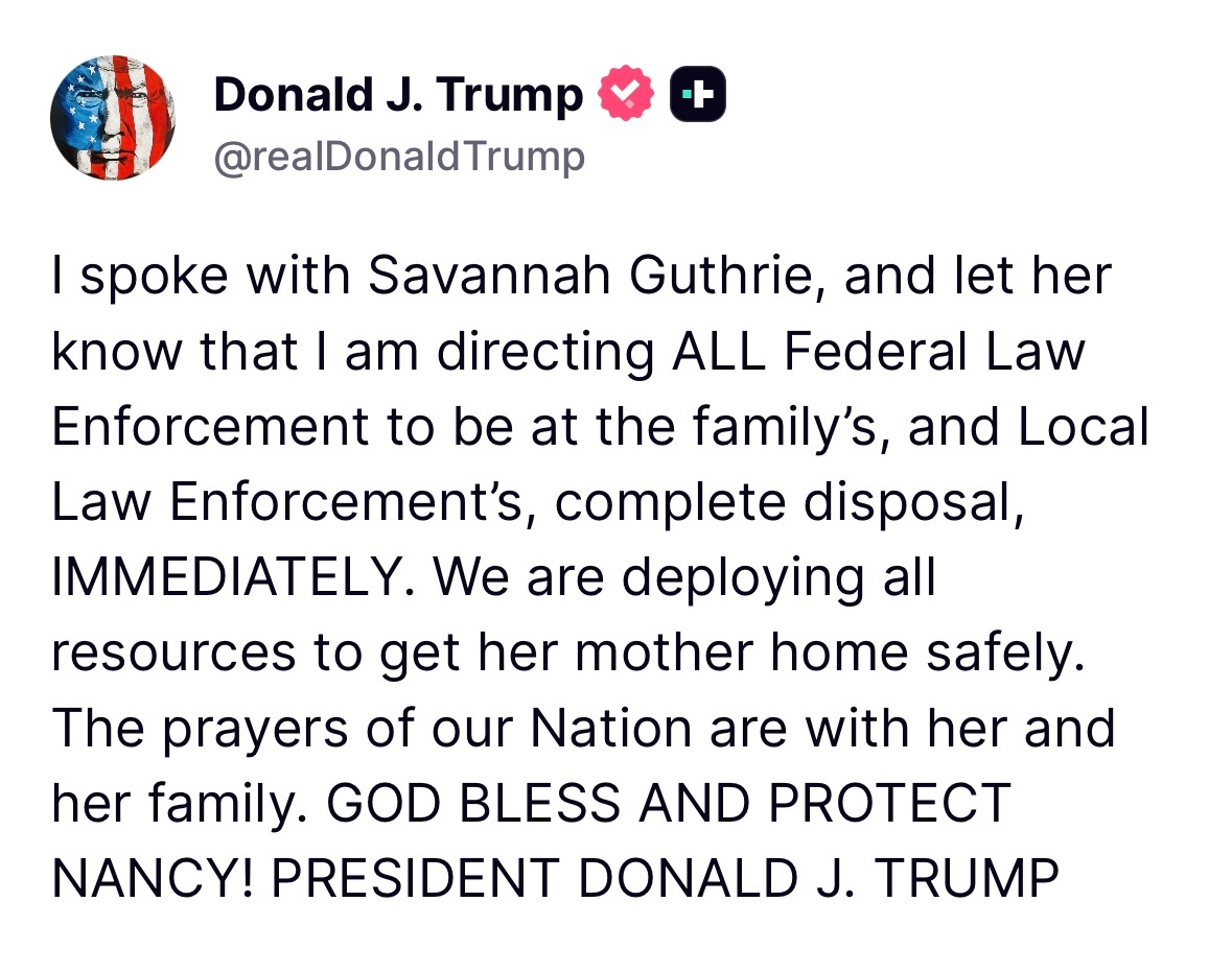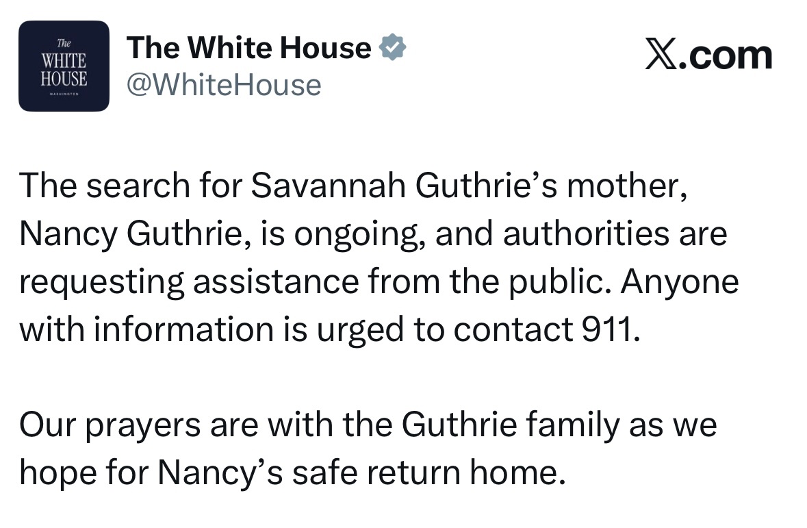白宫方面也迅速做出回应。美国总统特朗普亲自致电萨凡纳·格思里,表示已指示所有联邦执法部门立即全力投入行动,全面配合当地执法机构和这家人的一切需求。他强调,正在调动一切可用资源,力争尽快让南希·格思里平安回家,并代表全国人民为她和家人祈祷。特朗普在社交媒体上发文称:“我已经和萨凡纳·格思里通过话,并告诉她,我们正在做一切可能的事。愿上帝保佑并守护南希!”
