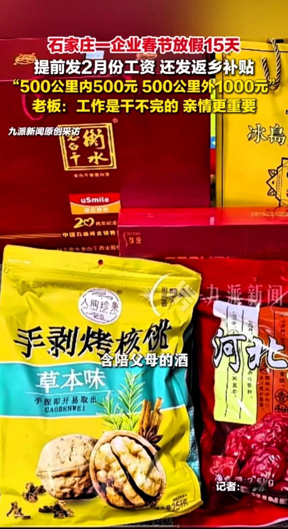 石家庄一企业春节放假15天,提前发2月份工资,还发返乡补贴。 500公里内500元补贴,500公里外1000元补贴。 老板还准备了大枣、核桃、酒品……让员工给父母带回家。 直言活是干不完的,亲情更重要,让员工安心回家陪家人过节。光是给返乡补贴这样的举动,简直是员工的梦中情司。 据老板所说公司都是老员工,十几年没有裁过员,不担心员工节后返乡问题。 按法律规定,春节法定假期3天是带薪的,加班得给3倍工资;调休日加班不补休要给2倍工资;企业额外给的假期,工资咋算就看企业规定和合同约定了。 这企业提前发工资还补贴返乡,员工过年肯定更踏实。不像有些公司,放假扣扣搜搜,工资也不按时发。 这样的良心企业,员工工作起来肯定更有动力,也能吸引更多人才,必须点赞!