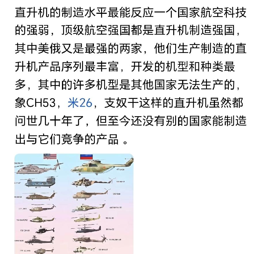 为什么你们口中的工业皇冠永远都在发生变化呢? 以前说我们没有航母,说我们的航母没有弹射起飞,说我们造不出五代机,说我们造不出先进的预警机…… 现在这些我们都有了,你们怎么又把直升机变成了工业皇冠呢? 我们确实没有造出米26,支奴干这样的直升机。 但你也不想想为什么这些直升机很多年前就出来了,却始终没有迭代呢?