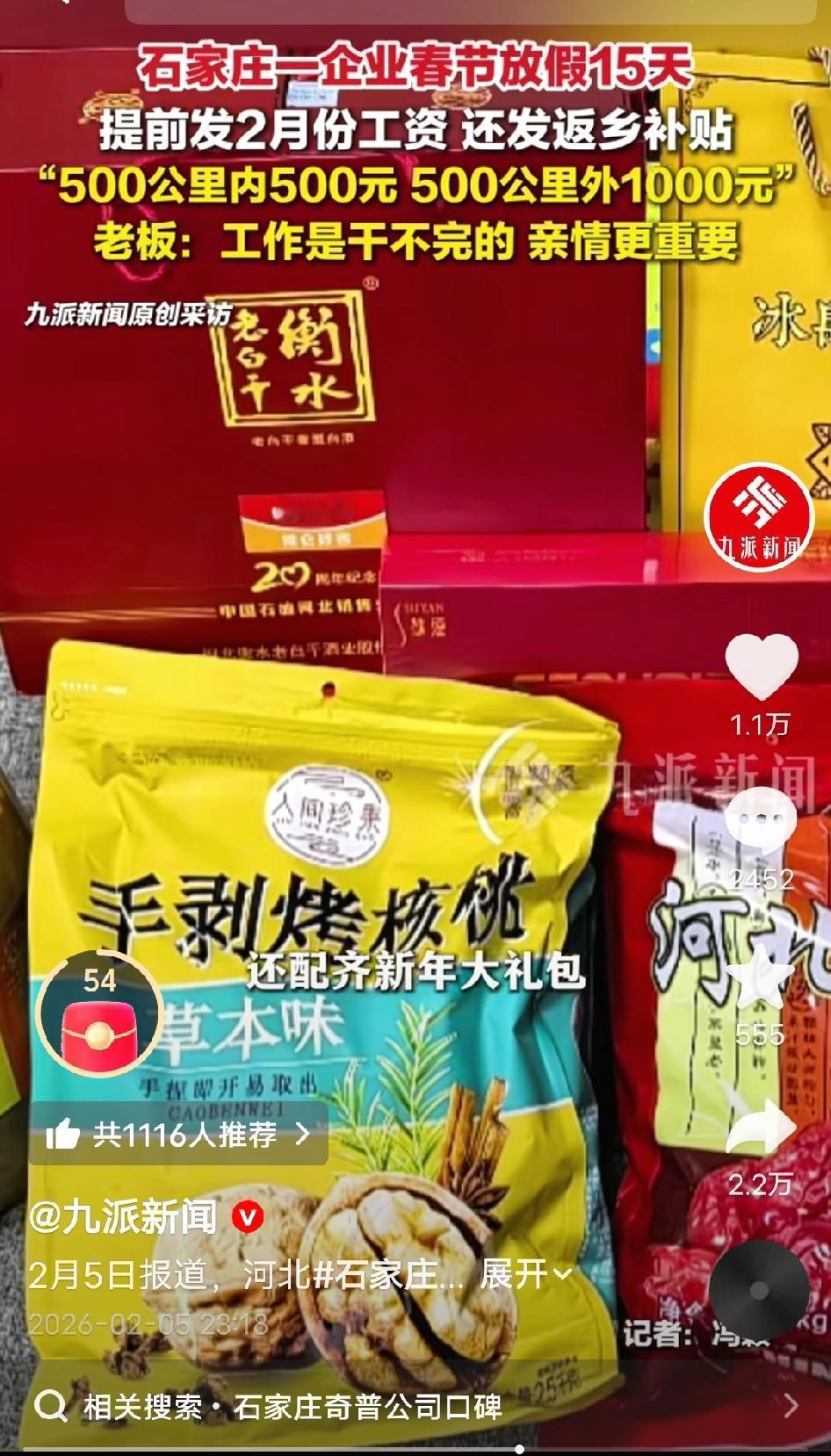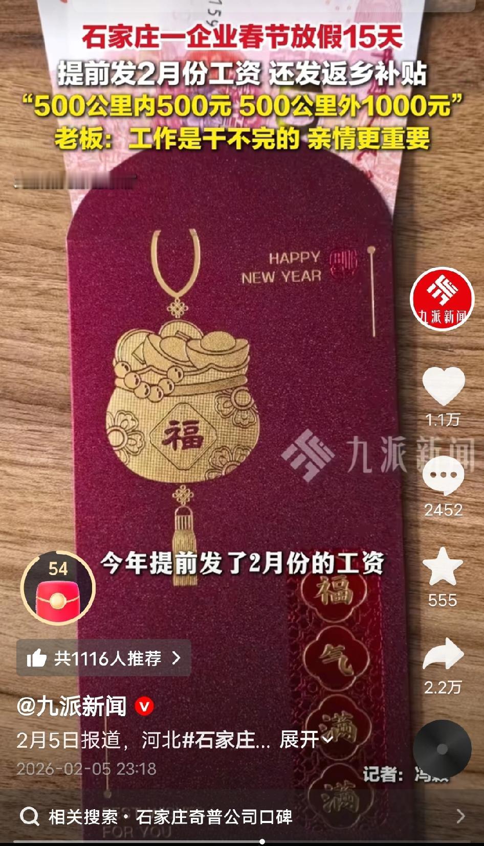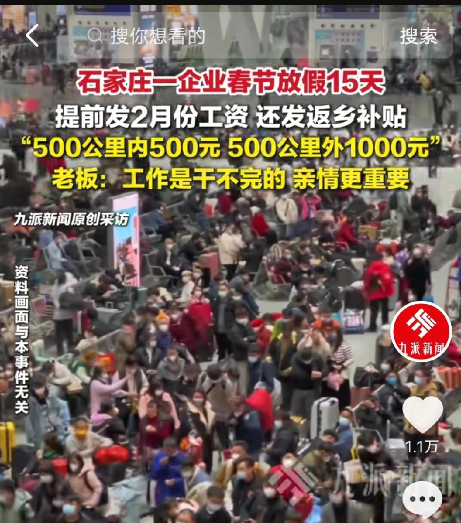 羡慕哭了!石家庄某公司的春节福利直接封神!15天超长假期、提前发2月工资、500元红包、分级交通补贴,白酒、茶叶、核桃的年货大礼包,老板苗总一句话,暖透了全网打工人的心! 2026年2月5日,春节的脚步越来越近,石家庄某公司里却早已年味十足。与其他公司忙着赶工不同,这里的员工脸上都挂着轻松的笑容,因为一份沉甸甸的春节福利已经送到了每个人手中。 最让人眼红的,当属那足足15天的春节假期,从2月10日一直放到2月25日,比法定假期多了好几天,让大家有充足的时间陪父母唠嗑、带孩子玩耍,彻底告别“假期不够用”的焦虑。 为了让大家过个富足年,公司更是提前将2月份的工资打到了员工卡上,还额外附上了一个500元的春节红包。钱虽不多,却解了大家的燃眉之急,让置办年货、走亲访友都更有底气。 考虑到春运返乡的路费是一笔不小的开销,公司贴心推出了分级交通补贴:离家500公里以内的补500元,500公里以外的直接补1000元,实实在在地为员工减轻了负担。 不仅如此,每位员工还领到了一个精心准备的新年大礼包。打开一看,里面有醇香的白酒、上好的茶叶、饱满的核桃和大枣,都是过年走亲访友的硬通货,公司连“孝敬长辈、招待亲友”的细节都想到了。 企业负责人苗总表示,这些福利不是一时兴起,而是已经坚持了十几年。他常说:“工作是干不完的,亲情更重要。”公司十几年来从未裁员,员工大多是并肩作战多年的老伙计,彼此信任,他从不担心大家节后返岗,只希望每个人都能带着温暖和底气,回家过个舒心年。 💬 讲真,看完我酸了!这哪是老板,这是把员工当家人疼啊! 15天长假,是给身心的彻底放假;提前发薪,是最实在的安全感;路费补贴,是懂你回家的不易;年货礼包,是藏在细节里的关怀。最难得的是,这份善意已经坚持了十几年,不是作秀,是刻在骨子里的企业文化。 打工人不怕辛苦,怕的是付出不被看见,努力不被尊重。这家公司用行动证明,最好的企业文化,从来不是画大饼,而是把员工的冷暖放在心上。愿这样有温度、有格局的公司越来越多,愿每一个努力打拼的人,都能被这样温柔以待! 石家庄神仙公司 春节暖心福利 工作是干不完的亲情更重要 打工人的福音