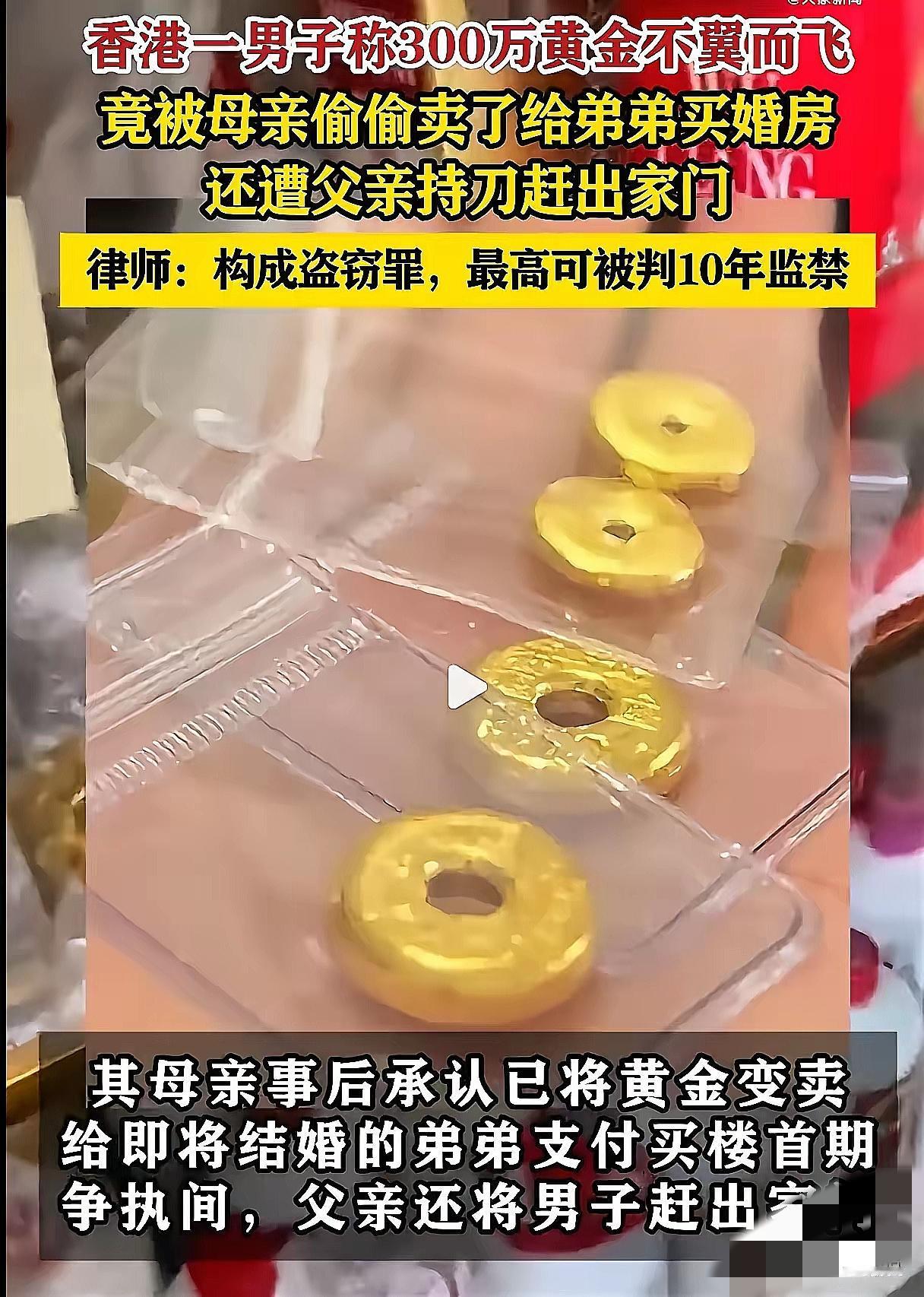 香港阿伟这事儿看得人心里堵得慌!省吃俭用15年攒下300万港元黄金, 想卖时发现被妈偷偷卖了给弟弟付婚房首付, 妈还轻描淡写让他再攒,爸更离谱,持刀把他赶出门骂他不为弟弟着想! 律师都说妈这是盗窃,最高能判10年,可阿伟最后没报警,还自愿给弟弟100万当礼物,只要还剩下的就搬出去。 有人说他软,可谁懂他的难?一边是半辈子血汗钱,一边是打断骨头连着筋的亲人,真报警了,这个家就彻底散了。 这种“亲情绑架”最伤人,把孩子的付出当理所当然,偏心偏到骨子里。 你们觉得阿伟这么做值吗?要是换成你,能做到这么让步吗?