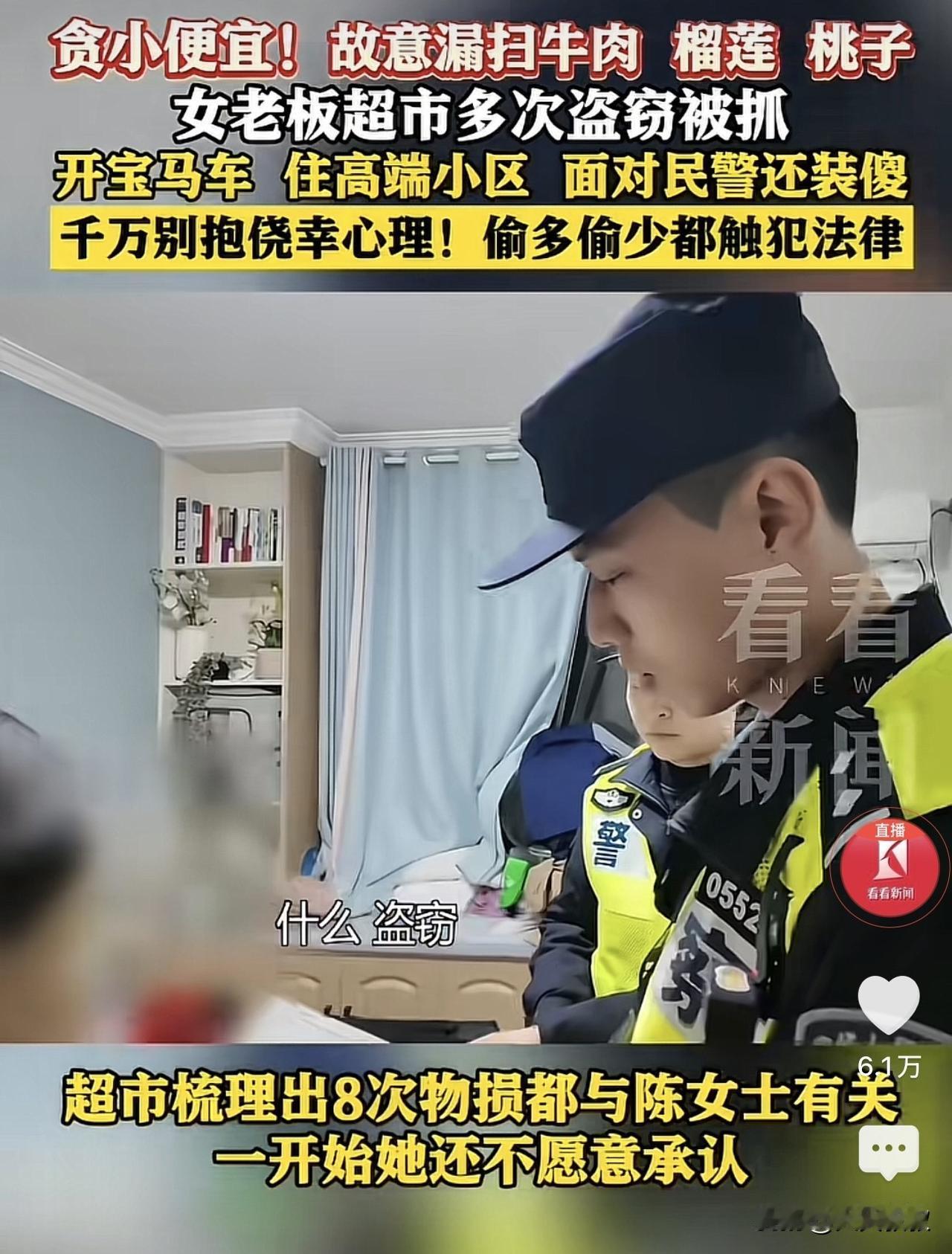 贪小便宜吃大亏!上海,一超市在盘货的时候发现有商品遗失,经过一番梳理发现,有八次的物损是和一名女子有关,报警后,警方很快找到了涉事女子,女子不仅开了一家公司,而且家住当地高端小区,还开着宝马车,当民警准备以涉嫌盗窃带走女子时,女子顿时懵了。 陈女士是某公司的老板,所以生活水平也不差,住在当地高端小区,而且代步车是一辆价值几十万的宝马车,虽然陈女士不差钱,但是却喜欢贪小便宜。 在陈女士家附近有一家超市,每当陈女士工作回家路过的时候,总是进去买一些水果、肉类等生活用品,所以自然而然的成了这家超市的常客。 可是,最近超市在盘点库存的时候发现,经常有一些莫名奇怪的货损,经过一番梳理发现,这些货损全部和陈女士有关,随后,超市选择了报警。 当民警来到陈女士家中询问时,陈女士表示,自己买的东西都付款了,不知道民警为何上门找自己。 虽然陈女士还在撞衫充楞,但是民警却告诉陈女士,有没有在购物的时候,多买少付? 原来,超市的监控显示,陈女士在超市购物的时候,买了两件商品,在自动结算机前,却只结算一件商品的钱,漏扫的不仅有40多块钱的水蜜桃,还有30多块钱的牛奶,8次加起来也有几百元了。 因为涉嫌盗窃罪,陈女士被民警带回了警局接受处理。 事发后,有网友表示自己就碰到过,上次在一家超市的自动结算机前,看到前面的一对夫妇买了很多东西,结果结算下来才100多,我就多嘴说了一句,那个还没有扫吧?结果人家很躲闪,我瞬间明白了。 还有人说,简直不可想象,开宝马,住豪宅,却为了这么点东西动脑子,应该查一查她的公司是否运行合法。 也有人说,就几百块钱就构成盗窃罪了?我记得盗窃罪不是好几千,上海起刑点更高。 确实如此,按照关于盗窃的司法解释的规定,盗窃数额1000-3000元的,才构成盗窃罪,按照上海这样的经济发达区域,盗窃数额往往要3000元以上才能够构成盗窃罪,陈女士只有区区几百元,根本达不到这样的数额,怎么会构成盗窃罪呢? 其实,这与盗窃罪的另外一个解释有关系,即多次盗窃的,也构成盗窃罪,就是在2年内3次盗窃的,无论盗窃的数额如何,也是构成盗窃罪的,就陈女士来看,她一共是有8次故意漏扫,显然已经达到了最低三次的标准,所以是构成盗窃罪的。 当然,也有人问,明明是漏扫,怎么还是盗窃?一般而言,漏扫并不成立盗窃,但是如果是多次漏扫,事后也没有回去补上货款,那么,这种行为就属于推定的明知,如果是一次可以理解,如果是一而再,再而三的话,就不是过失了,显然是故意。 当然,因为数额过低,如果陈女士在赔偿了超市获得谅解之后,一般是不予起诉,即便被起诉了,往往也是缓刑,但是,这件事情还是告诫大家,不要贪小便宜,尤其是监控这么发达的情况下,你的一举一动都在监控下,何必为了几块钱去丢这个人呢? 对此,你对本案有什么看法? —————————— 关注我,带你评析法律热点,关注冷暖人生。 文章原创,抄袭必究