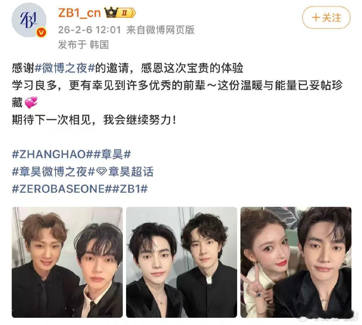 王一博章昊自拍照ZB1晒王一博章昊自拍 2月6日,晒了与章昊自拍照,并配文“感谢微博之夜的邀请,感恩这次宝贵的体验学习良多,更有幸见到许多优秀的前辈~这份温暖与能量已妥帖珍藏💞期待下一次相见,我会继续努力!”