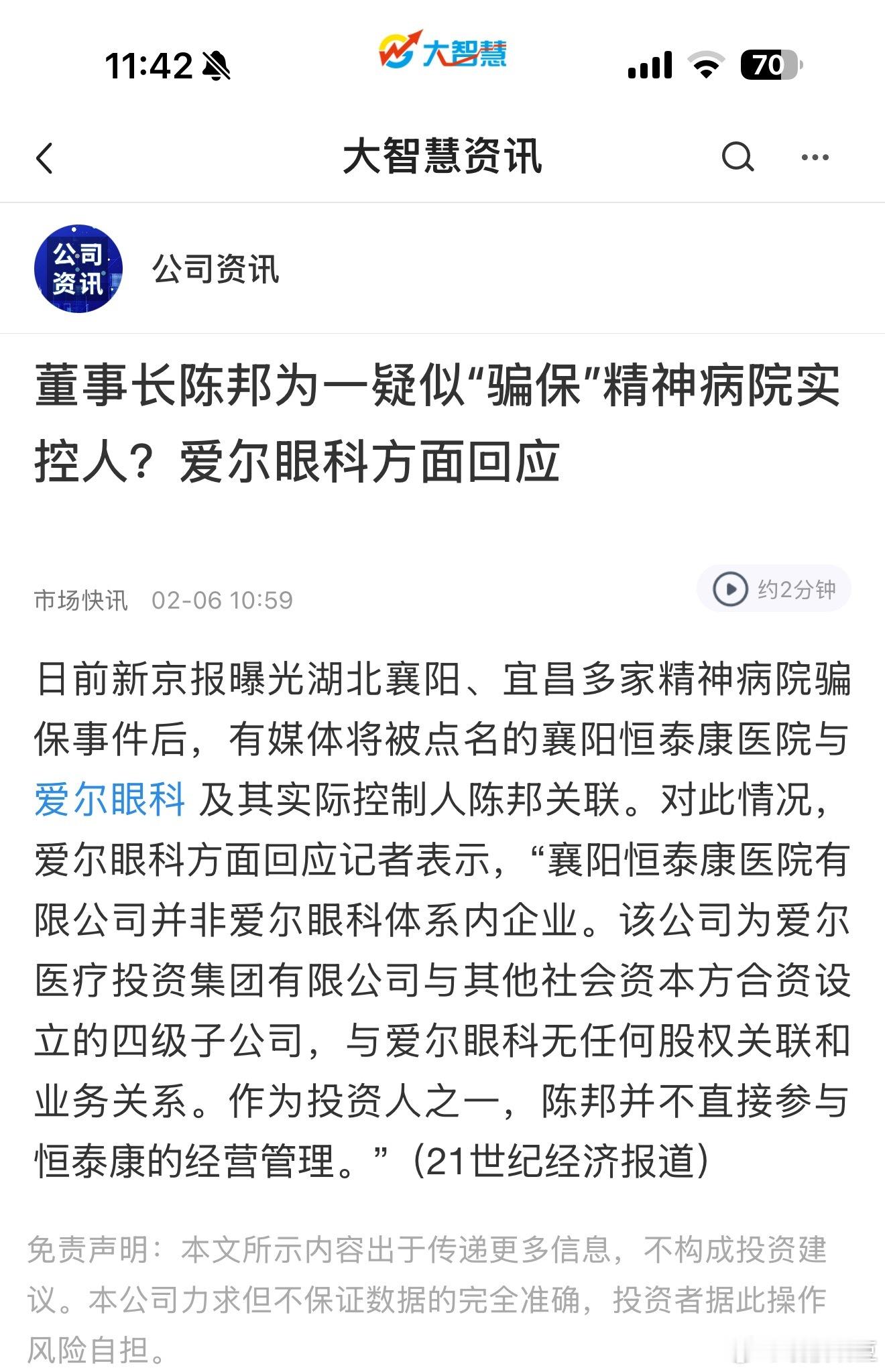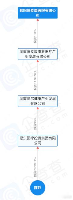爱尔眼科董事疑为骗保精神病院实控人爱尔眼科的回应 天眼查显示,爱尔医疗投资集团有限公司投资了两家公司,一家是爱尔眼科,投资34.33%,另一家是湖南爱尔健康产业发展有限公司,投资90%,这家公司投资81.9978% 给湖南恒泰康康复医疗产业发展有限公司,而这家公司100%控股襄阳恒泰医院有限公司。