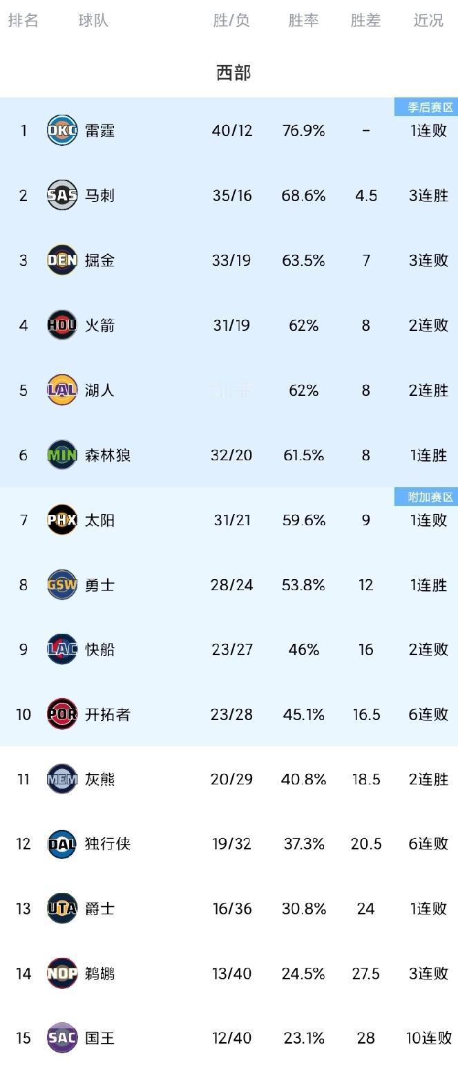 随着勇士赢卡位战;湖人反超森林狼升第5,三队胜负差相同;火箭连败,西部最新排名! 库里、布克继续缺阵,勇士客场大战太阳。赛前太阳排名西部第7,勇士第8,双方相差4个胜场。而本场比赛两支球队是三分对飚,勇士队比太阳多了4个(20-16),罚球多了14次(20-6)。同时科尔“立”起来了,减少了格林与波杰姆斯基的上场时间,波杰姆出场时间队内倒数第2,格林也才24分钟,最终勇士101-97力克太阳。 湖人八连主首战迎战76人,东契奇尴尬了。上半场湖人落后76人8分,东契奇腿筋不适返回更衣室,下半场直接退出了比赛。然而湖人在下半场掀起反攻浪潮,第三节追回6分,末节更是打出一波流,最终湖人119-115逆转76人,东契奇10中3还有5失误;詹姆斯表现也一般,17中7得到17分10助8攻失误。反观替补席的里夫斯成为真大腿,17投12中得到35分。 火箭99-109黄蜂!交易截止日,毫无作为的火箭队遭遇两连败。球队面对近期状态火热的黄蜂是一点儿办法都没有,三分失准8/24,看家本领篮板球也输40-46,同时失误偏多,尤其杜兰特与阿门合计11次,再加上申京只有7分的尴尬表现。明知道自身弱环,就是不改变,火箭队看起来比上赛季还不如。 其他比赛,马刺7人得分上双135-123送独行侠6连败,戴维斯被交易,欧文很可能赛季报销,目前球队又处于连败之中,所以独行侠本赛季目标就是锻炼弗拉格,好在后者很给力,连续四场得分上30+,得到32分,文班亚马29分11篮板6助攻2抢断3盖帽。 西部最新排名,如下图。马刺喜提三连胜,35胜16负还是排名第二,不过领先身后的掘金扩大至2.5个胜场,暂时坐稳了第二的位置。火箭队吃到两连败,湖人两连胜升第5,再加上森林狼,三者胜负差相同,排名依旧紧咬。太阳31胜21负第7。勇士结束两连败,28胜24负位居第8。