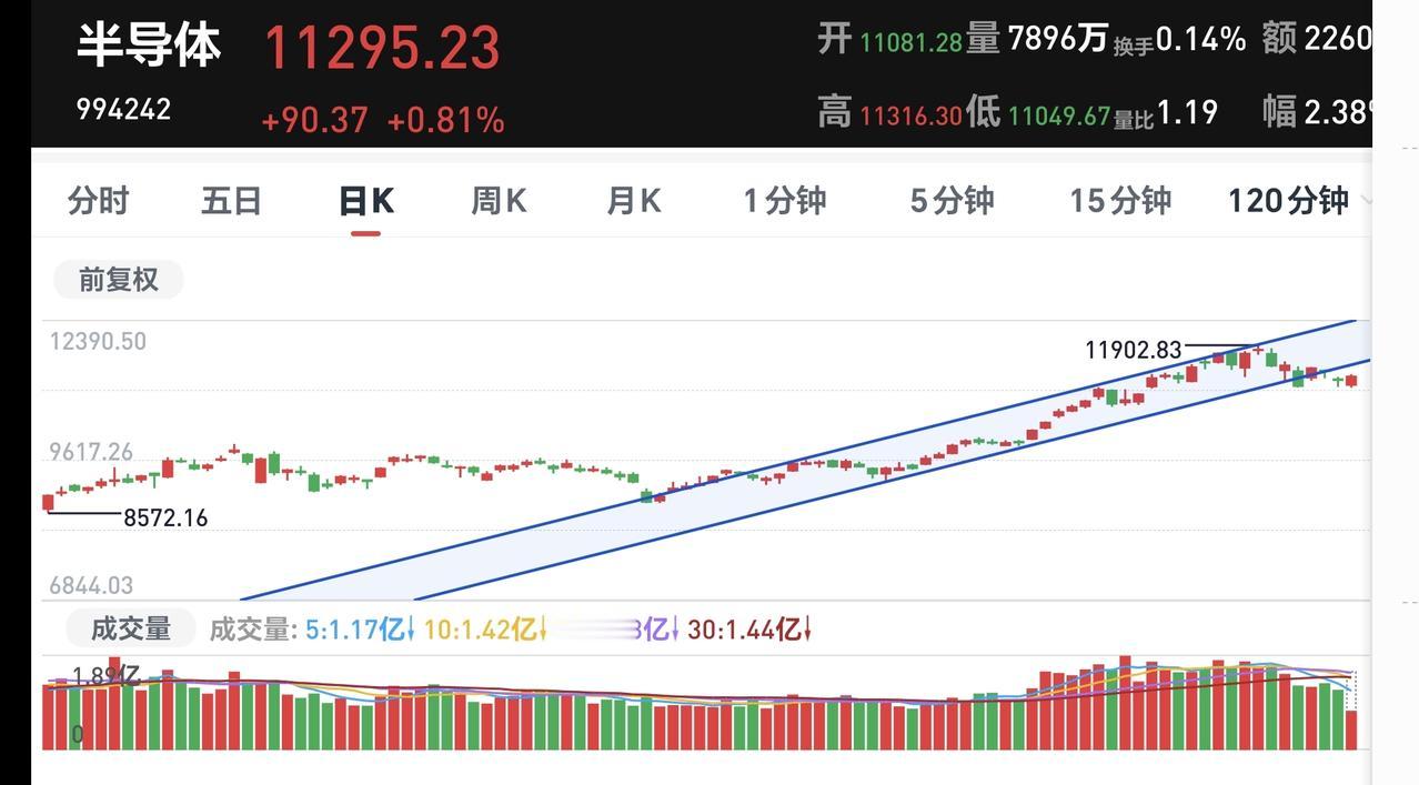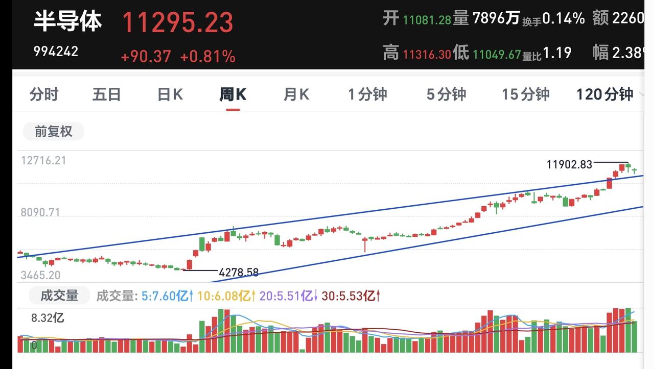 基金:半导体板块应该怎么办 市场下午开盘以后还是小幅度震荡,黄色线是高高在上,只要黄色线能够保持住高高在上,今天下午跳水的可能性就不大,但今天大幅度上涨的可能性也不大,因为,萎缩的成交量不支持大幅度上涨,在黄色线高高在上,但成交量萎缩的情况之下,只能是一个震荡的走势。 半导体板块今天也是上涨的,盘中估值上涨了0.30%,持有人数在所有板块当中排名第2位。 看下面的截图6,这是半导体板块日K线图,前几天下跌跌破了日线级别短期上涨通道下轨线,今天虽然上涨了,但并没有能够收回到原来的上涨通道内,现在还是处于破位状态之中,对于这样的上涨是要谨慎对待的。 看下面的截图7,这是半导体板块周K线图,现在的位置还是处于上涨通道的上方,这个板块还是处于周线级别上涨趋势中,长线持有的人可以继续持有。 持有的基金中,估值上涨幅度最大的三个板块是:新能源汽车板块,创新药板块,可控核聚变板块,下跌幅度最大的三个板块是:白酒板块,AI应用板块,军工板块,估值整体上涨了2027元。 花一秒钟点赞,花30秒钟评论,就是对我最大的支持,谢谢大家的支持。