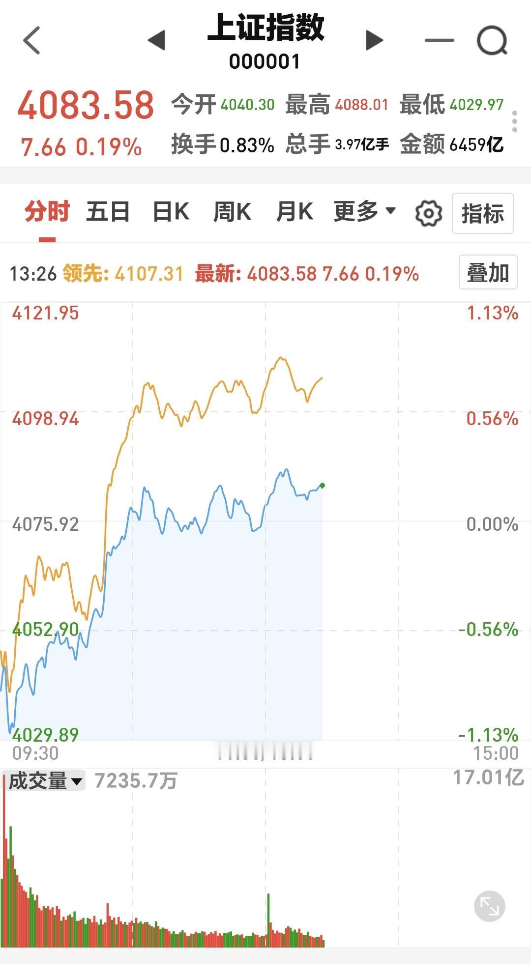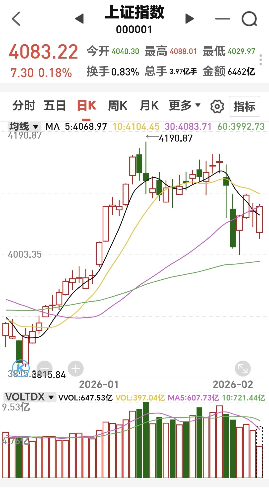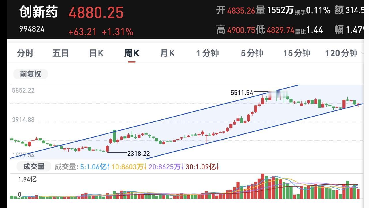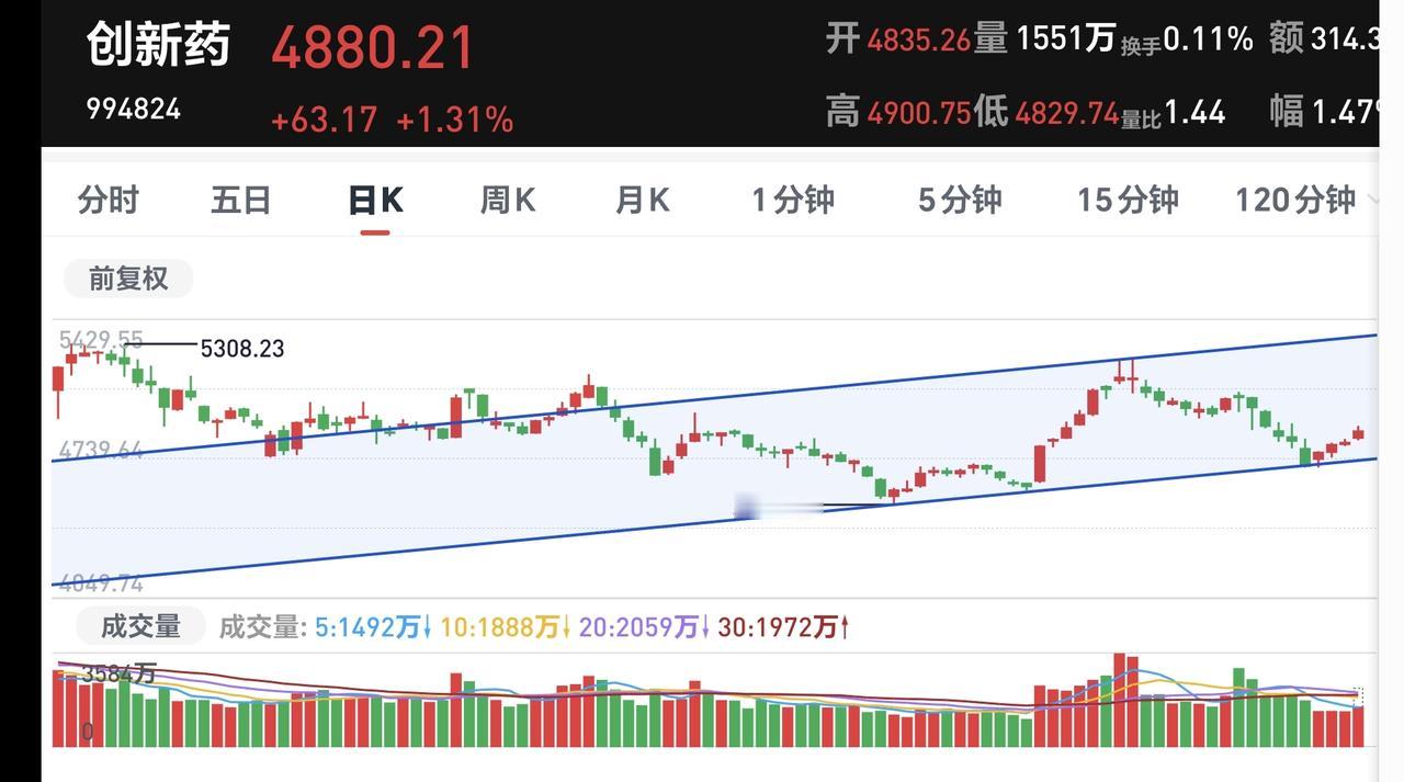 基金:创新药板块和光伏板块 市场指数下午继续小幅度震荡,是在五天线之上的震荡,是黄色线高高在上的震荡,这样的震荡会让你觉得很安心,因为不会大幅度下跌,创业板指上涨了0.53%,盘中点位3277点,上证指数上涨了0.19%,盘中点位4083点。 我们来看一下下面的截图4,这是上证指数日K线图,今天的上涨并没有能够突破日线级别短期下跌通道的上轨线。也就是说,虽然今天上涨了,但还处于日线级别短期下跌趋势中,今天的上涨并没有能够改变日线级短期的下跌趋势。 现在两市累计成交15221亿,相比于昨天同期缩量了3%上上涨3900多家,下跌1300多家,涨停59家,跌停5家,主力资金净流出37亿。 看下面的截图6,这是主力资金进出板块的情况,主力资金净流入最多的三个板块是:电池板块,新能源板块,机器人板块,主力资金净流出最多的三个板块是:人工智能板块,国企板块,传媒板块。 持有的基金中,估值上涨幅度最大的三个板块是:新能源板块,5G板块,先进制造板块,下跌幅度最大的三个板块是:白酒板块,大消费板块,军工板块,估值整体上涨了3752元。 所有的基金中,今天上涨14056家,下跌5321家,上涨幅度超过5%的有10家,下跌幅度超过5%的有2家。 看下面的截图10,这是创新药板块日K线图,现在的位置处于日线级别上涨通道中,前段时间调整下跌到上涨通道下轨线附近止跌反弹,已经连续上涨了4个交易日,短线持有的人可以继续持有。 看下面的截图11,这是创新药板块周K线图,现在的位置处于上涨通道内,距离上涨通道的下轨线很近,在不跌破上涨通道下轨线的前提下,这里是长线持有者可以考虑要不要进场的地方,长线持有的人完全可以继续持有。 看下面的截图12,这是光伏板块日K线图,现在的位置处于这个上涨通道中,短线持有的人可以继续持有,除非跌破这个上涨通道的下轨线,才可以考虑要不要止盈出来观望。 看下面的截图13,这是光伏板块周K线图,现在的位置也是处于周线级别上涨通道中,长线持有的人可以继续持有,这个上涨通道的下轨线,就是长线持有者的持有条件。 今天究竟应该怎么办?我会在评论区留言。 花一秒钟点赞,花30秒钟评论,就是对我最大的支持,谢谢大家的支持。