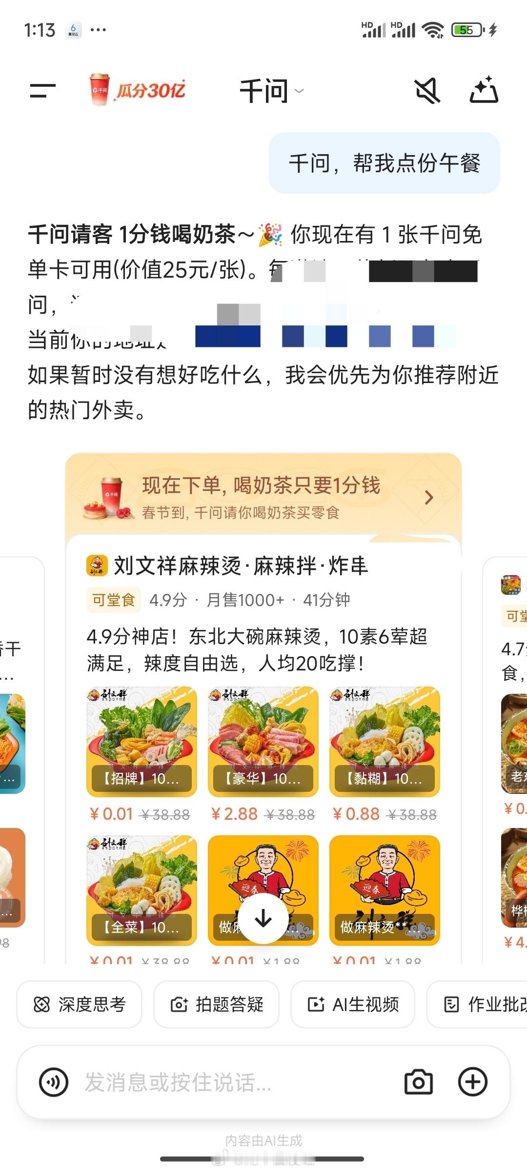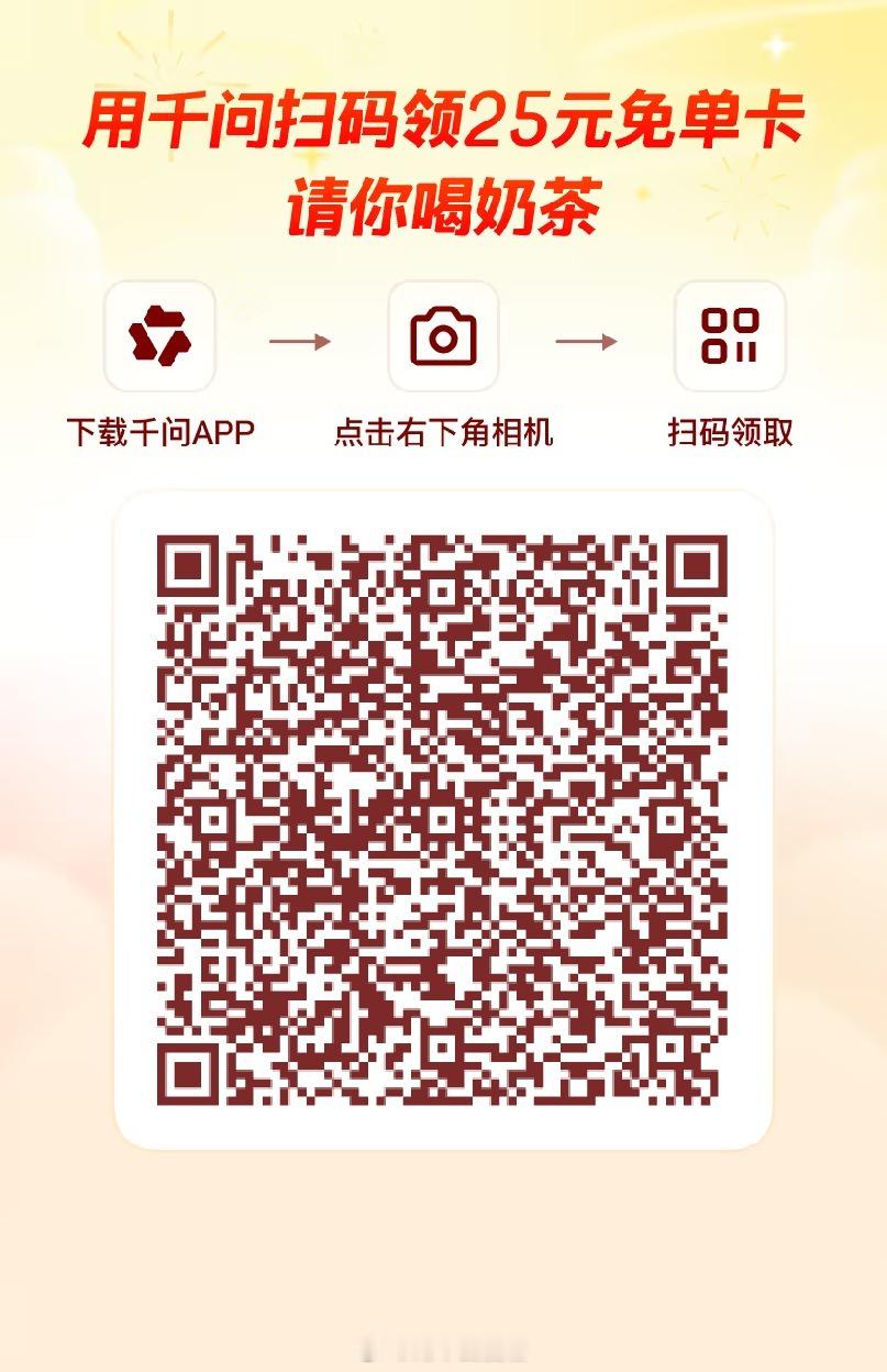 千问 免费奶茶千问送奶茶了!免费的为什么不喝薅羊毛方法:扫图一码即可领取25元代金券。其实不仅可以喝奶茶,也可以点麻辣烫、炸鸡、各种面、饭、日用品等。扫码领券后让千问帮你点你想要的东西,即可使用25💰券啦!