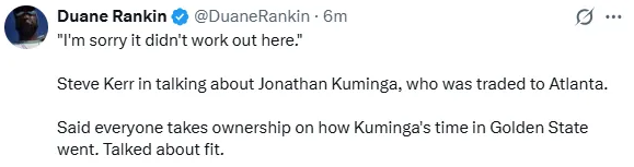 勇士对阵太阳的比赛即将开始。 赛前,勇士主教练科尔接受媒体采访,在谈到乔纳森-库明加的交易时说: “我很遗憾他在这里没能成功,每个人都应该为库明加在勇士的表现负责。在他被交易之前,我和库明加进行了一次很好的谈话。我认为库明加本可以做得更好。” 本赛季,库明加场均得到12.1分5.9篮板2.5助攻。 在此前的一笔交易中,勇士将希尔德和库明加送至老鹰,换回波尔津吉斯。