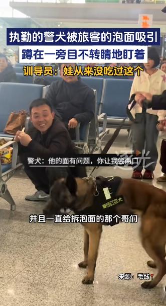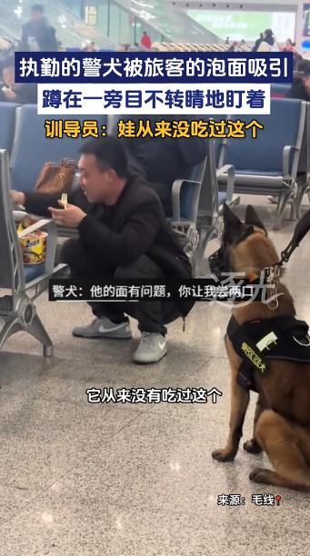“笑不活了!”2月1日,陕西西安,一男子在火车站候车时,觉得有点饿,便泡了桶泡面吃,没想到路过的警犬闻着味后,直接蹲在男子面前,被香的走不动道,看的男子直接笑了出来,一旁的训导员只能尴尬解释,它没吃过这个!网友:看给孩子馋的! 近日,陕西西安北站的候车大厅早已被出行的旅客填满,熙熙攘攘的人群里,行李箱滚轮的声响、旅客的交谈声交织在一起,氤氲着热水的热气和各式食物的淡淡味道,这是车站独有的人间烟火。 谁也没想到,一桶再普通不过的泡面,会让这里上演一幕让人忍俊不禁的小插曲,主角还是一位威风凛凛的执勤警犬。 一名男子独自坐在靠近热水区的座位上候车,翻遍背包拿出一桶泡面,他熟门熟路地拆开包装、倒入调料包,接来滚烫的热水泡好后,将泡面桶放在座位边缘,静静等候面饼泡软。 这是无数旅客候车时都会做的小事,平凡到毫不起眼,却偏偏吸引了一位特殊的 “小观众”。 此时,车站的安保执勤正有序进行,一只警犬紧随训导员身后,在候车大厅开展例行巡查。 它身姿挺拔,步伐沉稳且富有节奏,耳朵警惕地竖着,目光扫过大厅的每一个角落,每一个动作都透着专业与训练有素。 作为车站安保的重要力量,它早已习惯了大厅的人来人往,却在路过男子座位旁的那一刻,突然停下了前行的脚步。 泡面桶里飘出的浓郁香气,混着面饼的麦香,对这只常年吃定制犬粮和训练专用零食的警犬而言,是从未接触过的陌生味道。 警犬的嗅觉本就远比普通动物灵敏,在大厅的繁杂气味中,这股独特的香气瞬间抓住了它的注意力。 它微微歪头,鼻尖快速且频繁地抽动,仔细分辨着香味的来源,随即朝着泡面桶的方向靠近两步,稳稳蹲了下来,所有的注意力都集中在那只冒着淡淡热气的泡面桶上。 训导员起初以为它发现了可疑物品,立刻提高警惕,顺着它的目光看去,却只看到一桶普通的泡面。 男子低头时也发现了脚边的警犬,四目相对的瞬间,他先是一愣,下意识检查自身行李,反复确认后,才留意到身旁的泡面成了唯一的 “特殊物品”,看清警犬目不转睛盯着泡面的模样,他紧绷的神经瞬间放松,忍不住笑出了声。 训导员随即向男子轻声解释,为警犬的驻足打扰表达了歉意。 两人的交流引来了周围旅客的注意,大家纷纷侧目,看到蹲在地上的警犬那副被香味吸引、乖巧专注的模样,都忍不住露出笑容,有人还拿出手机,悄悄记录下这有趣的一幕。 镜头里,警犬依旧专注地盯着泡面桶,对周围的目光毫不在意,偶尔鼻尖再抽动几下,仿佛在认真感受这股独特的香味。 短暂停留后,在训导员的引导下,警犬便转身跟着继续开展巡查工作,这一幕暖心又有趣的小插曲,也让周围旅客的候车时光多了几分欢乐。 原本枯燥的候车时光,因为这只被泡面香气吸引的警犬,多了几分欢乐与温暖。 一场因泡面引发的小插曲,没有惊天动地的情节,却让我们看到了警犬威严背后的柔软与纯粹。 它们平日里是守护车站平安的 “卫士”,用专业的能力为旅客的出行保驾护航,而在这一刻,它们只是被陌生香味吸引的小动物。 这份反差,让冰冷的安保工作多了几分温度,也让平凡的候车时光,留下了一段温暖又有趣的回忆,给匆匆赶路的人们,带来了一份意想不到的欢乐。 如果各位看官老爷们已经选择阅读了此文,麻烦您点一下关注,既方便您进行讨论和分享,又能带来不一样的参与感,感谢各位看官老爷们的支持!