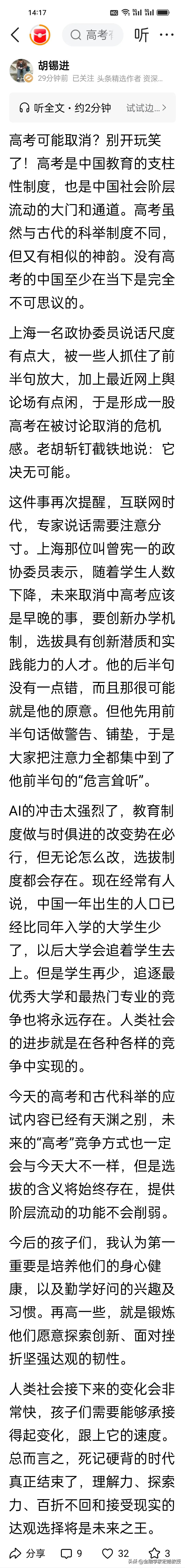 刚刚,胡锡进发文说,取消高考绝无可能! 高考真的会取消吗?最近上海政协委员提出的取消中高考这个话题吵上了热搜,老胡直接拍板:绝无可能! 在他看来,高考不只是中国教育的支柱,更是普通人打破阶层壁垒、向上流动的核心通道。哪怕未来学生人数减少,顶尖大学和热门专业的竞争也只会更激烈。选拔制度或许会变,但“公平竞争”的内核永远不会消失。 与其纠结“取消”的伪命题,不如教会孩子适应变化的韧性。毕竟,真正的成长从来不是避开竞争,而是学会在风浪里站稳脚跟。你觉得高考未来会怎么变?