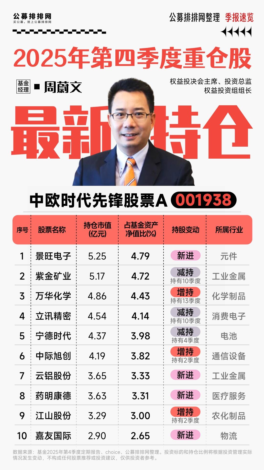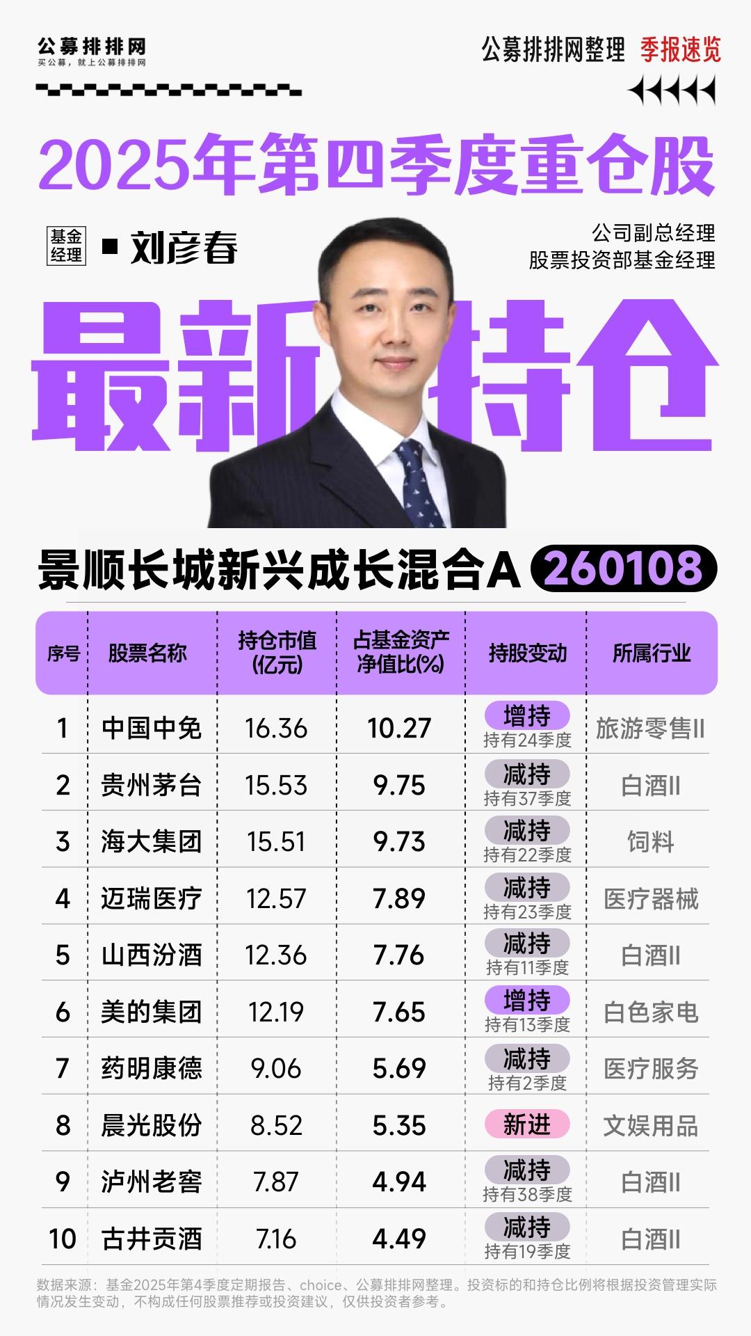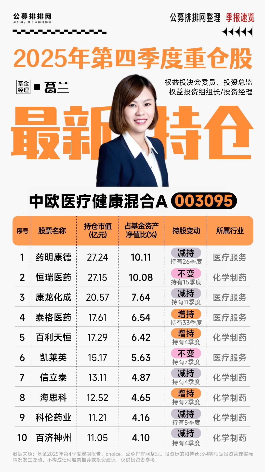 葛兰、张坤等知名基金经理最新持仓出炉! 据公募排排网,公募基金2025年4季报披露完毕,从2025年全年行业变动来看,基金对通信行业的投资由2025年1季度852.13亿元,跃升至2025年4季度的3576.18亿元,全年投资市值大涨319.67%。 有色金属表现也不容小觑,由1季度的1239.52亿元升至4季度的2932.95亿元,全年投资市值大涨136.62%,大幅跑赢其他行业。 2025年的行业动向与个股选择,共同勾勒出了公募基金的核心布局图谱,这也是众多基金经理,特别是葛兰、张坤、刘彦春、谢治宇、周蔚文等知名基金经理们的市场共识。 葛兰:继续看好创新药!前十大重仓股进一步集中! 截至2025年底,葛兰前十大持仓占比从第1季度的55.30%上升4季度至64.20%,对医药股的持仓进一步集中,显示了其坚定的医药赛道投资风格。 面对2026年,葛兰在4季报中表示,2026年1季度医药板块在宏观环境改善、产业政策支持与创新推进的共振下,有望延续结构性行情。投资机会将主要聚焦于创新药械产业链出海进展与技术迭代,设备器械板块的国产替代进程、消费医疗的需求复苏与困境反转机会也值得关注。中长期看,中国医药产业在全球范围的角色正从跟随向引领蜕变,持续看好医药行业的长期投资价值。 张坤:护城河还在,城在不在? 2025年,张坤整体持仓保持稳定,以白酒、科技和能源板块为核心,但季度间有微调。 张坤在4季报中还表示,始终对组合中企业的商业模式、竞争壁垒和现金流产生能力充满信心,不用太担心“护城河还在,城在不在”的问题。市场先生的出价已经使得一些优质公司即使私有化也是非常划算的,对长期投资者是很好的机会。 刘彦春:重仓白酒、医疗器械、消费龙头 2025年刘彦春重仓股集中于白酒、医疗器械及消费龙头上。 刘彦春在4季报中表示,经济结构调整最终的目标仍然是国民福利的持续提升。对此,其始终看重企业的商业模式,看重企业长期的股东回报水平,相信困难只是暂时的,并会更加努力寻找值得长期投资的优秀公司进行布局。