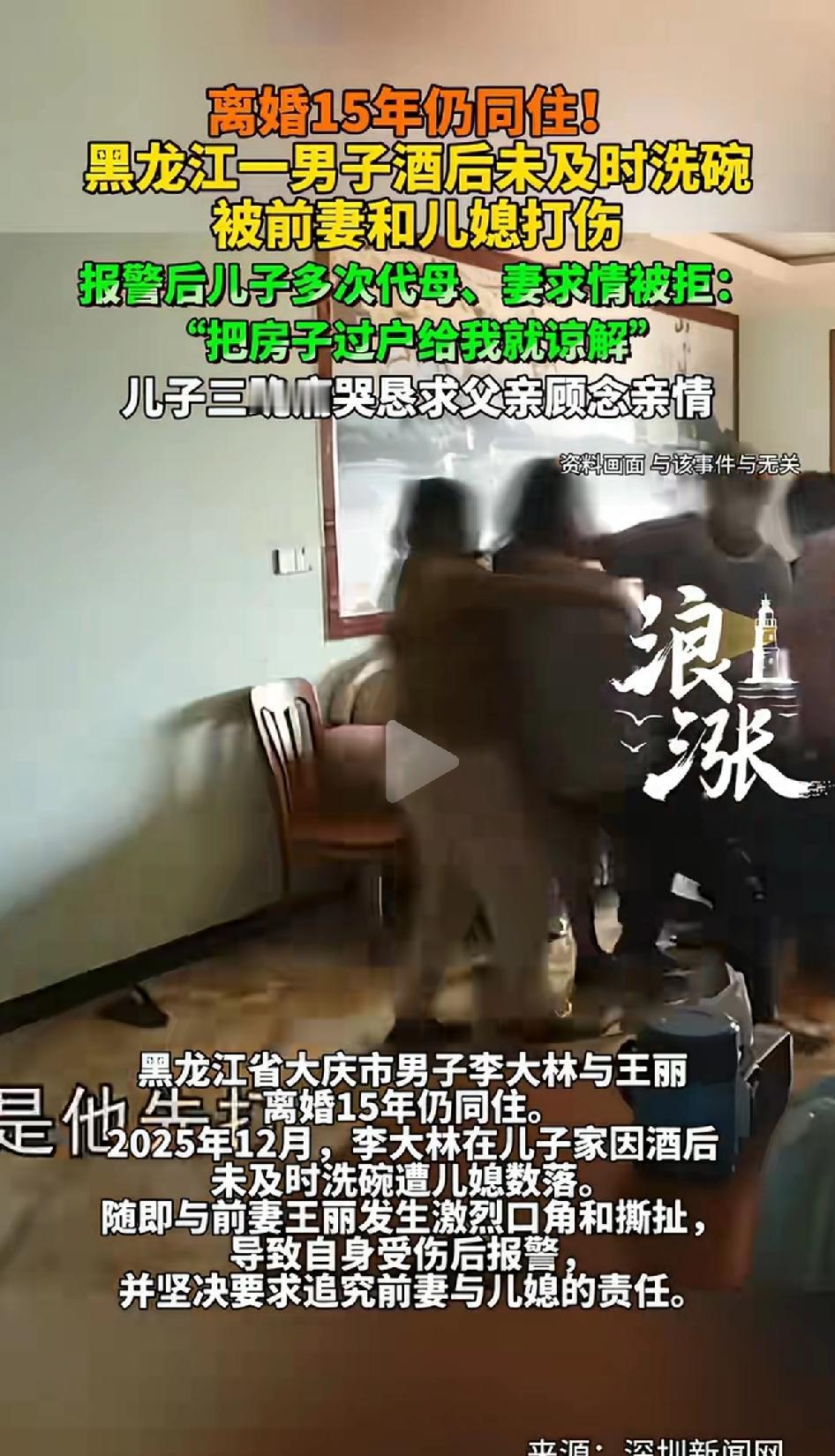 离婚15年仍同住,黑龙江一男子酒后未及时洗碗,被前妻和儿媳打伤。报警后儿子多次代母、妻求情被拒:“把房子过户给我就谅解”,儿子三跪祈求父亲顾念亲情原谅母亲和妻子的行为。 黑龙江这事儿太抓马了!李大林和前妻离婚15年还住一块儿,就因为酒后没及时洗碗,遭儿媳念叨数落,后直接和前妻、儿媳干起来了。 这冲突升级得比坐火箭还快,李大林前胸都被抓伤,还报警要追究责任。看来是伤的不轻,如果单纯的撕扯也谈不上追责。 调解时他要儿子把自己出资买的房过户,这要求让调解僵住了。 还好儿子李华给力,三次跪地磕头求原谅。李大林到底还是被亲情打动,选择原谅。 网友说得对,离婚了还住一起就是埋雷,家庭里边界感太重要了。 离婚后就不该继续住在一起,男的也糊涂,生活在日常琐碎中难免起冲突。 这也提醒咱,家庭相处得互相包容,不然一点小事就能闹得鸡飞狗跳。