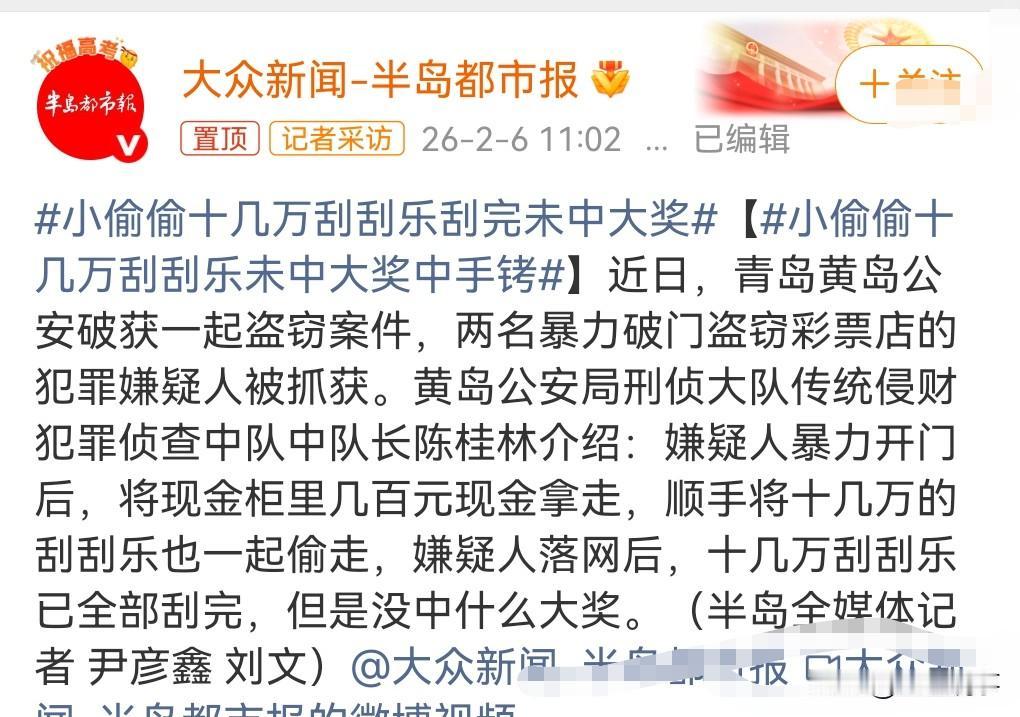 这中奖概率也太低了吧。 近日,青岛。两个小偷,进入一家彩票店偷窃,偷了几百块钱的现金。 然后拿走了价值十几万的彩票。 可是这十几万的彩票刮完了,竟然没中什么大奖。 这可是十几万的彩票啊,竟然没中大奖,看来刮刮乐真是不能够太沉迷啊!这中奖概率太低了。