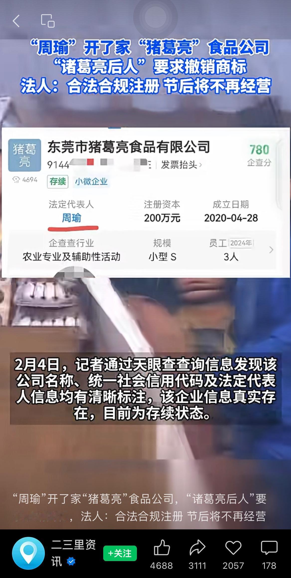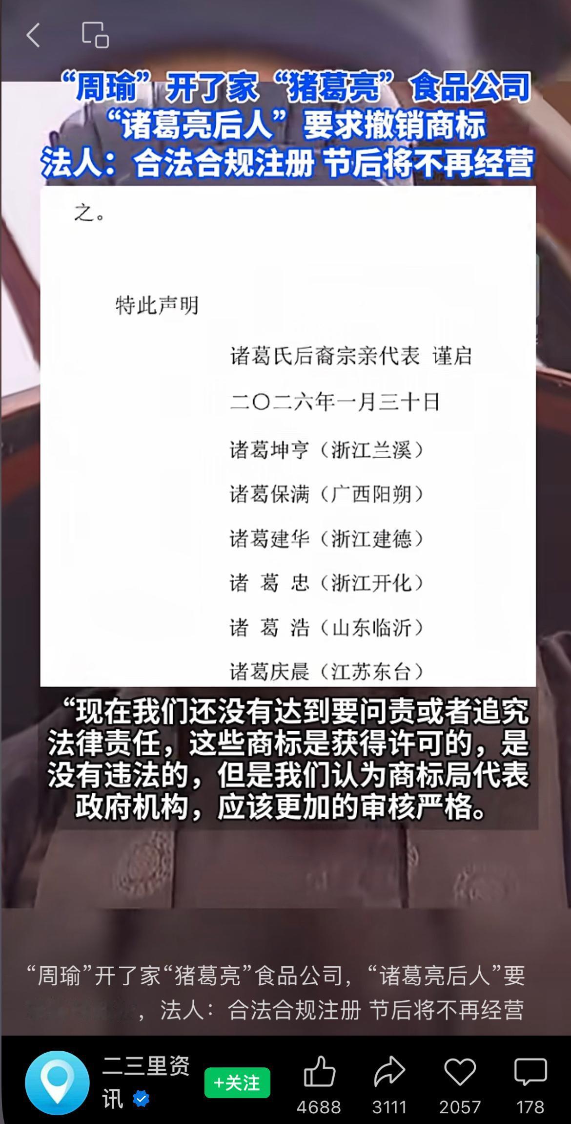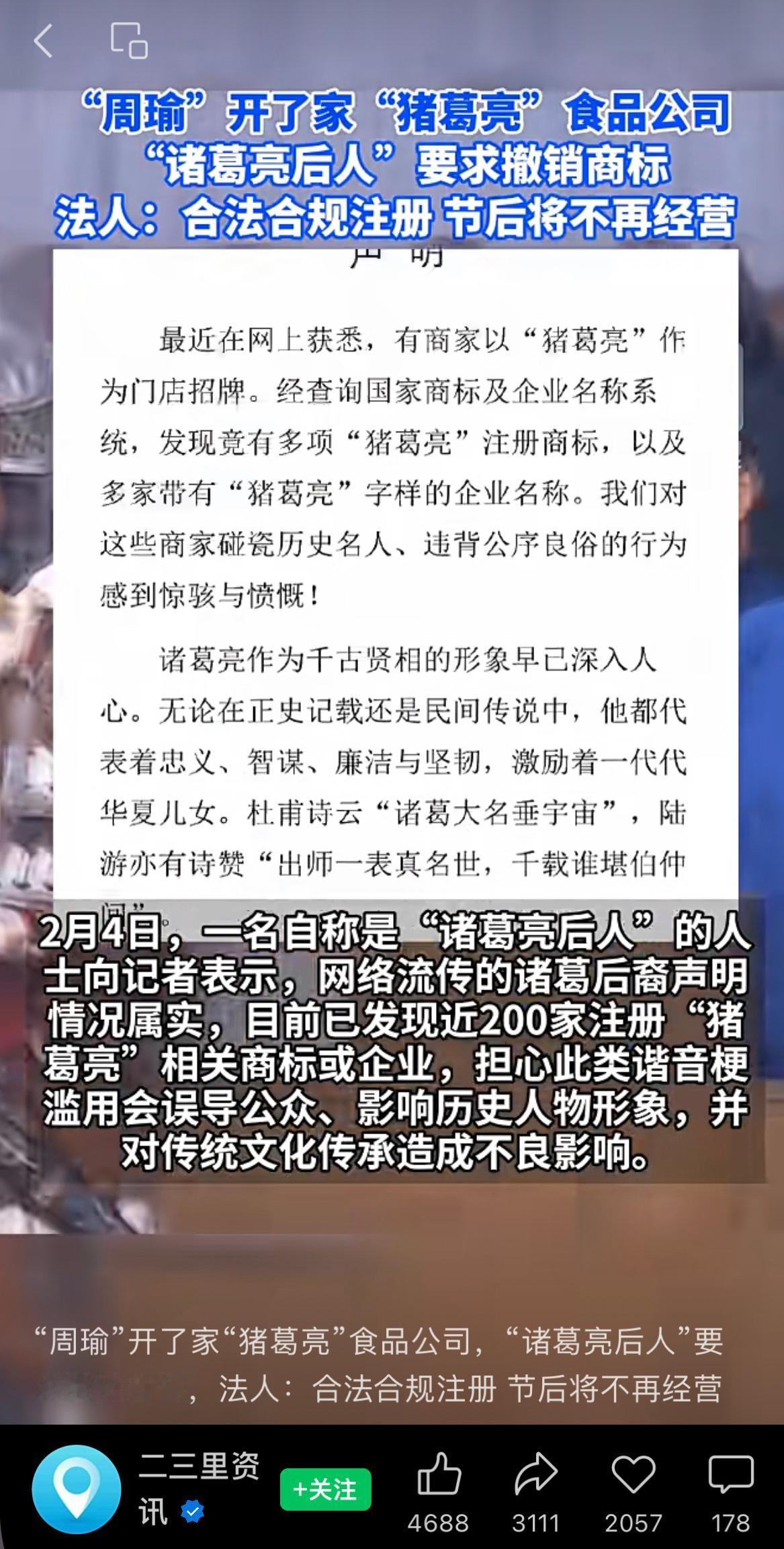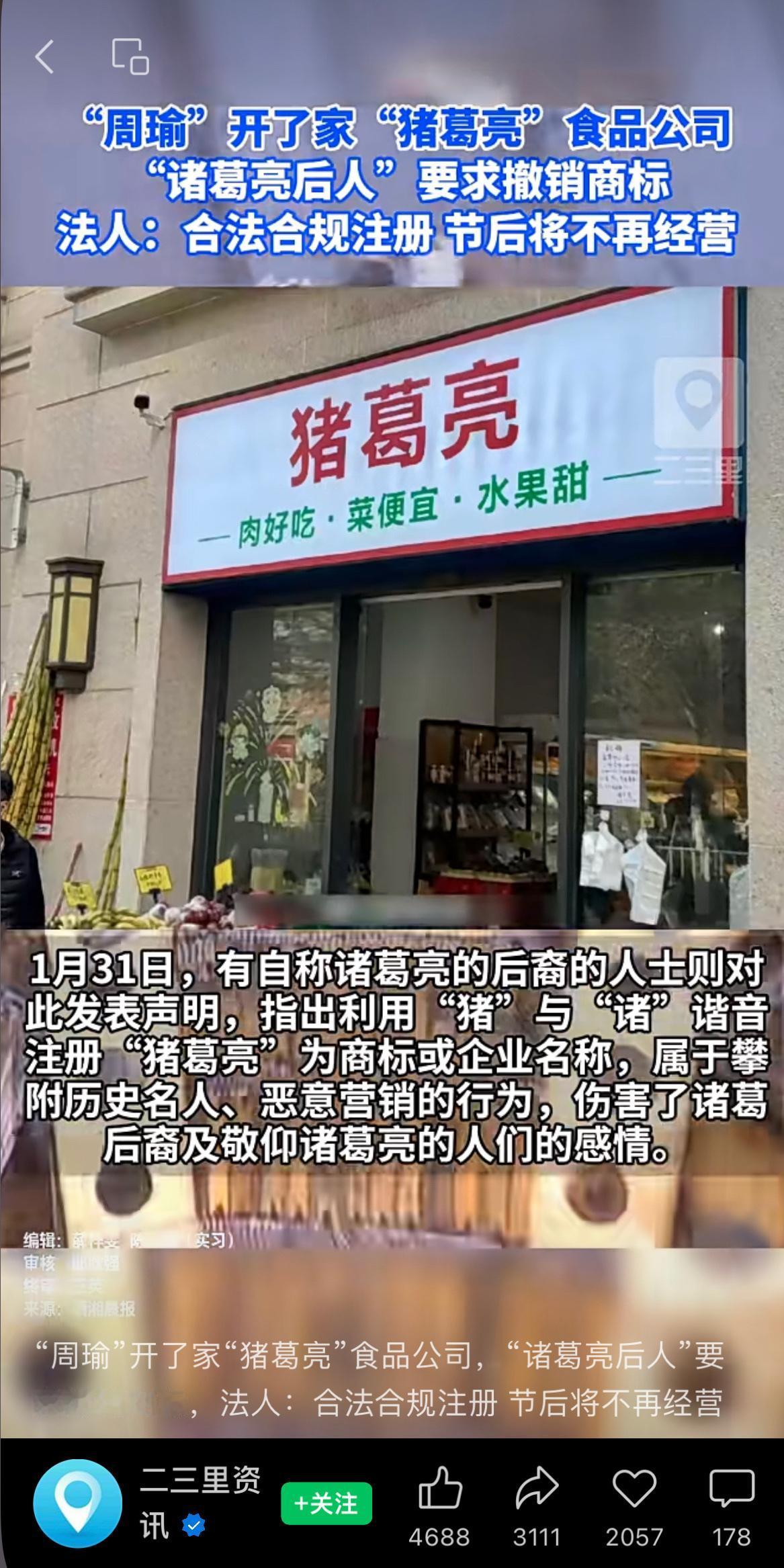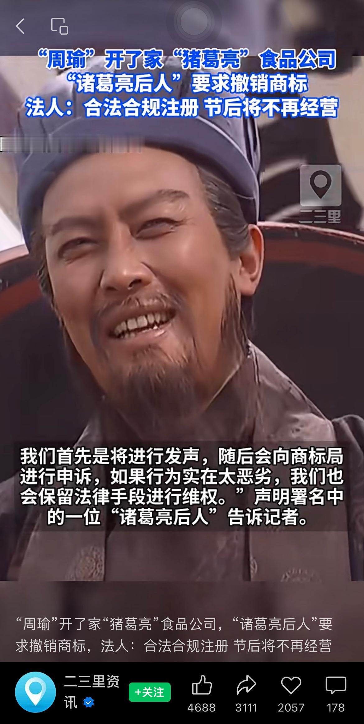 “周瑜”开了家“猪葛亮”食品公司,“诸葛亮后人”要求撤销商标,法人:合法合规注册,节后将不再经营。 没想到“周瑜”在现代赢了一局[允悲] 周瑜 诸葛亮