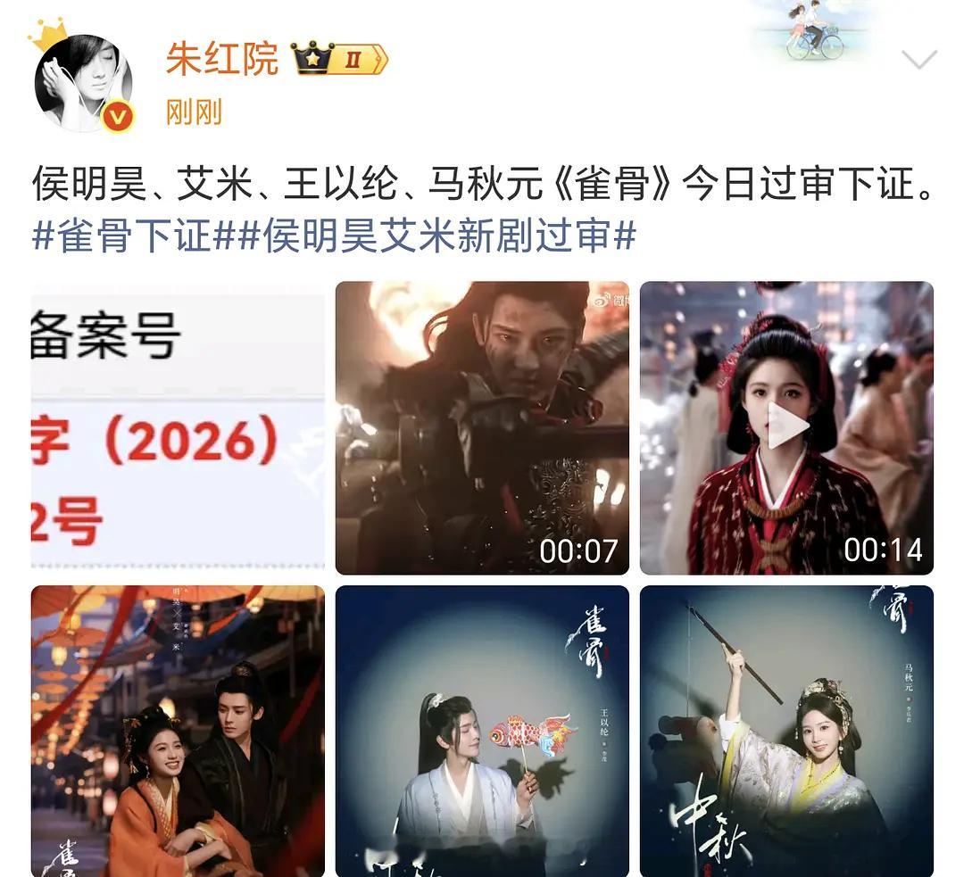 侯明昊、艾米、王以纶、马秋元《雀骨》今日过审下证好快啊,杀青没多久吧
