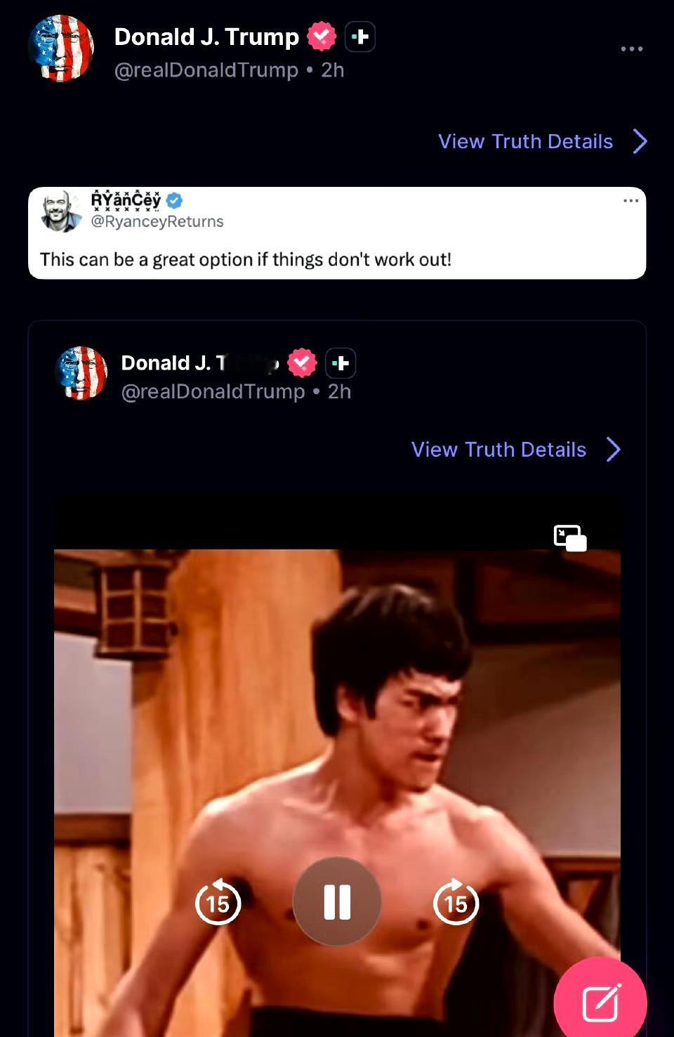 特朗普发布一段李小龙踢场虹口道场的视频,并配文“如果事情不顺利,这会是一个很棒的选择!”