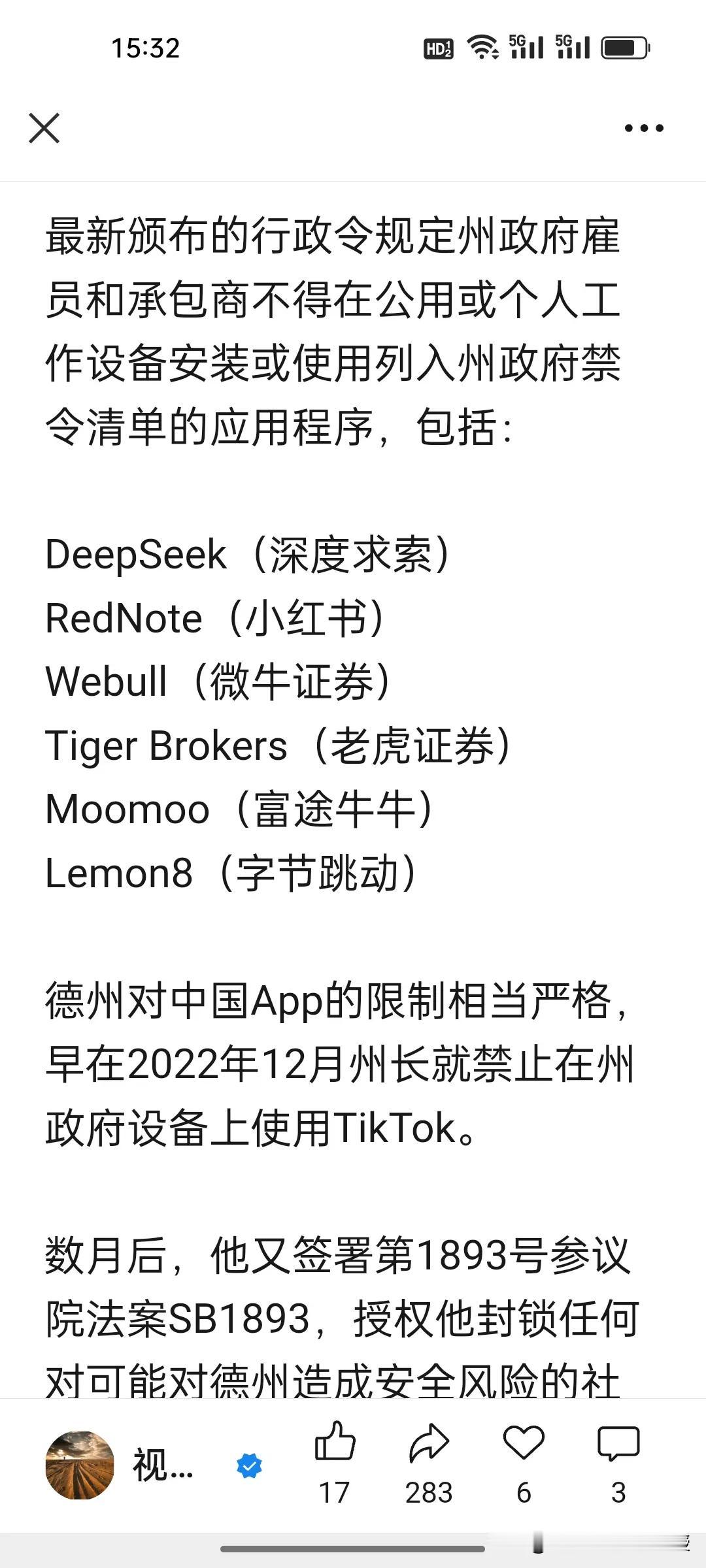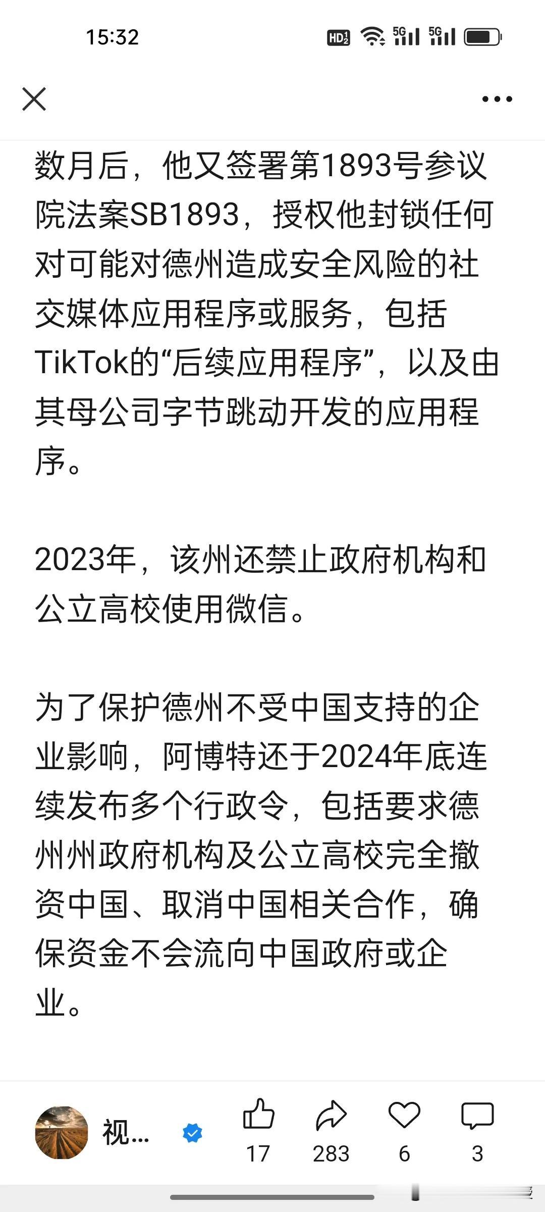 美国德州为何疯狂封杀中国App?40万华人50家中企遭波及。 美国德州州长阿博特再挥封杀棒,从今年1月31日起,禁用小红书、DeepSeek等6款中企应用,成首个禁DeepSeek的州,背后竟波及40万华人与50家中资企业! 其以“国家安全”为幌子,实则是共和党州长为捞政治资本,借反华博支持;德州作为能源重镇,还想借炒作遏华转嫁本土发展矛盾。德州40万华人日常社交、理财被限,50家中企的政府端合作全面受阻,此前还曾禁TikTok、微信,反华操弄愈演愈烈。 政治作秀终会伤及民生,这场封杀谁是真正受害者?