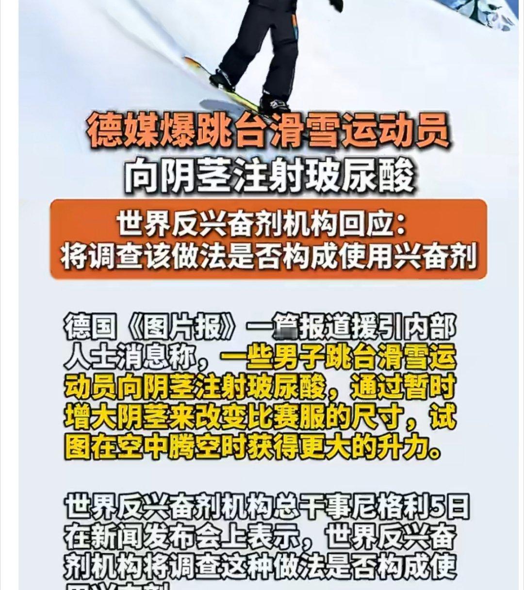 德媒爆跳台滑雪选手为提升成绩向阴茎注射玻尿酸 世界反兴奋剂机构启动调查德媒爆滑雪运动员向阴茎注射玻尿酸 据德国《图片报》援引内部人士消息报道,一些男子跳台滑雪运动员为提升运动表现,竟采取向阴茎注射玻尿酸的极端方式。他们试图通过暂时增大阴茎来改变比赛服尺寸,从而在空中腾空时获得更大升力,以在跳跃中取得更好成绩。报道称,跳台滑雪运动员需接受全身3D人体扫描,以确保紧身滑雪服没有冗余材料。这一规定反而催生了投机空间:运动员认为若阴茎增大,就能获得更大尺寸的滑雪服,进而增加空气升力,延长滞空距离。世界反兴奋剂机构(WADA)总干事奥利维尔·尼格利在新闻发布会上回应了这一事件,表示将立即调查该做法是否构成使用兴奋剂。目前,跳台滑雪相关管理机构也已关注此事,后续调查结果或将对该项目的规则和反兴奋剂标准产生重要影响。这一离奇事件也引发了体育界对“边缘性违规行为”的讨论:在追求成绩的压力下,运动员可能会突破伦理与规则的边界,而反兴奋剂体系也面临着不断识别和封堵这类灰色地带的挑战。