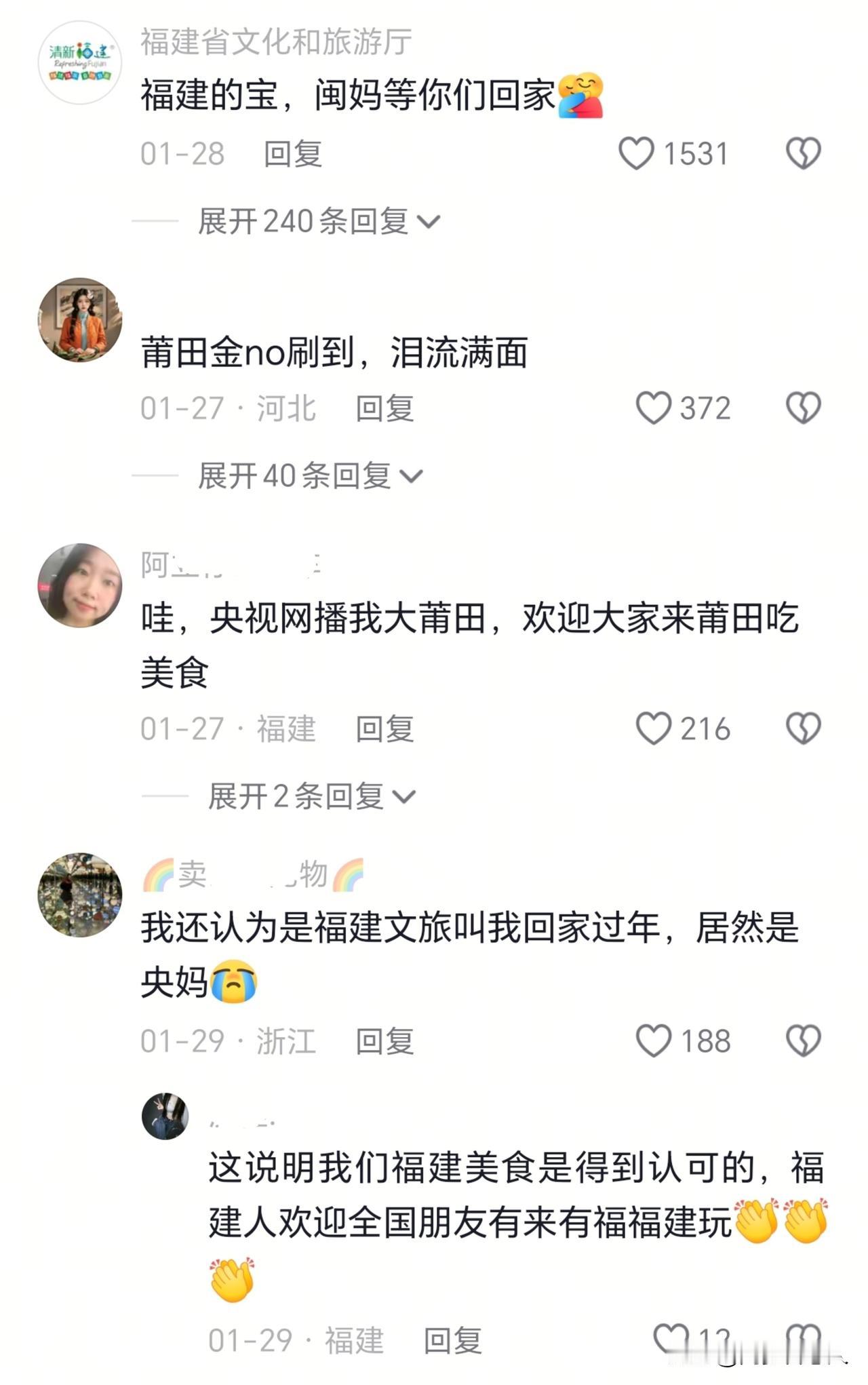 福建人真的是太幸福了,央妈文旅竟然亲自给福建在外的孩子喊话回家过年。 有网友说这是因为福建的美食得到了认可! 个人觉得,有没有一种可能,那就是之所以能刷到央视文旅向福建在外的游子喊话,是因为剧到的网友,他本身就是福建人,事实上央视文旅也向其他省在外的游子,喊话了! 其他省的网友,有没有剧到是央视文旅喊话回家过年的信息呢?