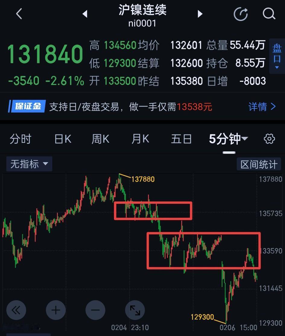 沪镍,今天一分钟级别趋势背驰的结构并不明显,随后的五分钟一笔上重新回到了第二个一分钟中枢内,目前结构上仍是围绕第二个中枢的震荡延伸。夜盘,如果从133640开始的五分钟一笔下能止步于129300上方,暂可当做一分钟级别的二类买点来把握。如果五分钟一笔下破坏129300,做"多单"只能再等一分钟级别新的买点形成。