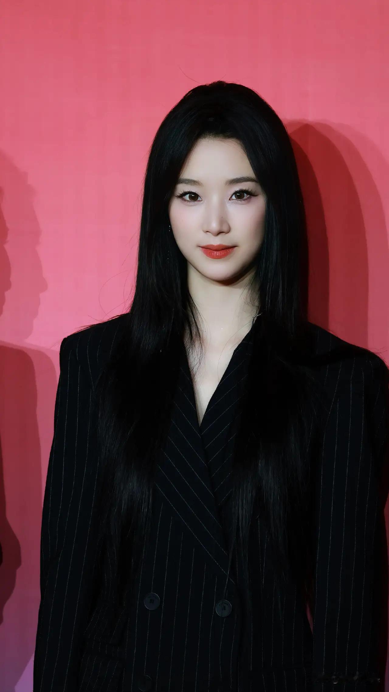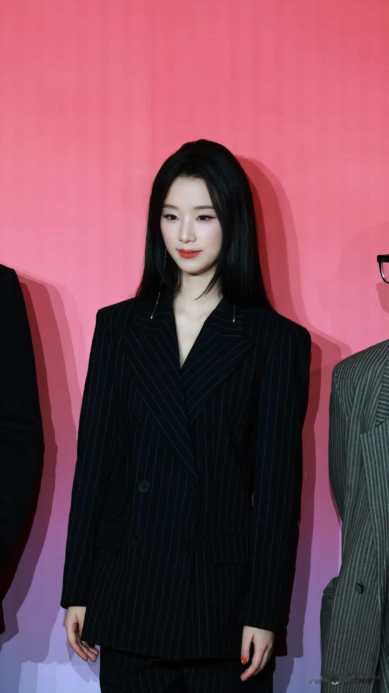 王小亿搭配黑色条纹西装,红唇魅惑,时尚女郎的魅力瞬间。