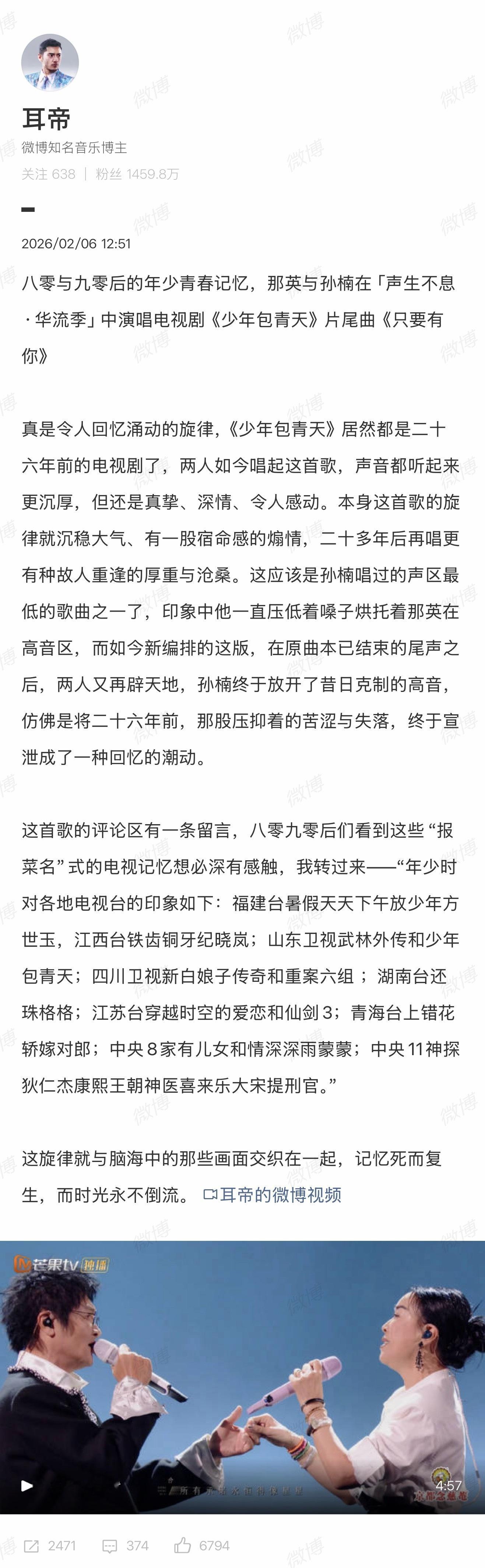 耳帝评那英孙楠只要有你耳帝:两人如今唱起这首歌,声音都听起来更沉厚,但还是真挚、深情、令人感动 🥹!声生不息华流季