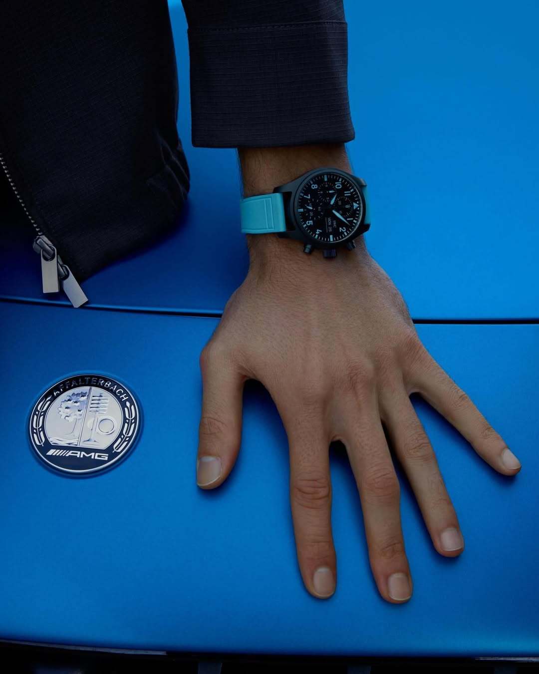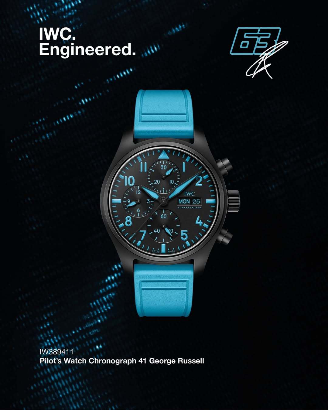 乔治拉塞尔亲自参与设计,IWC飞行员计时腕表,由黑色的氧化锆陶瓷打造,到处都有拉塞尔标志性的蓝色元素,钛金属表背还有63的数字,感觉比车队的马石油色更好看
