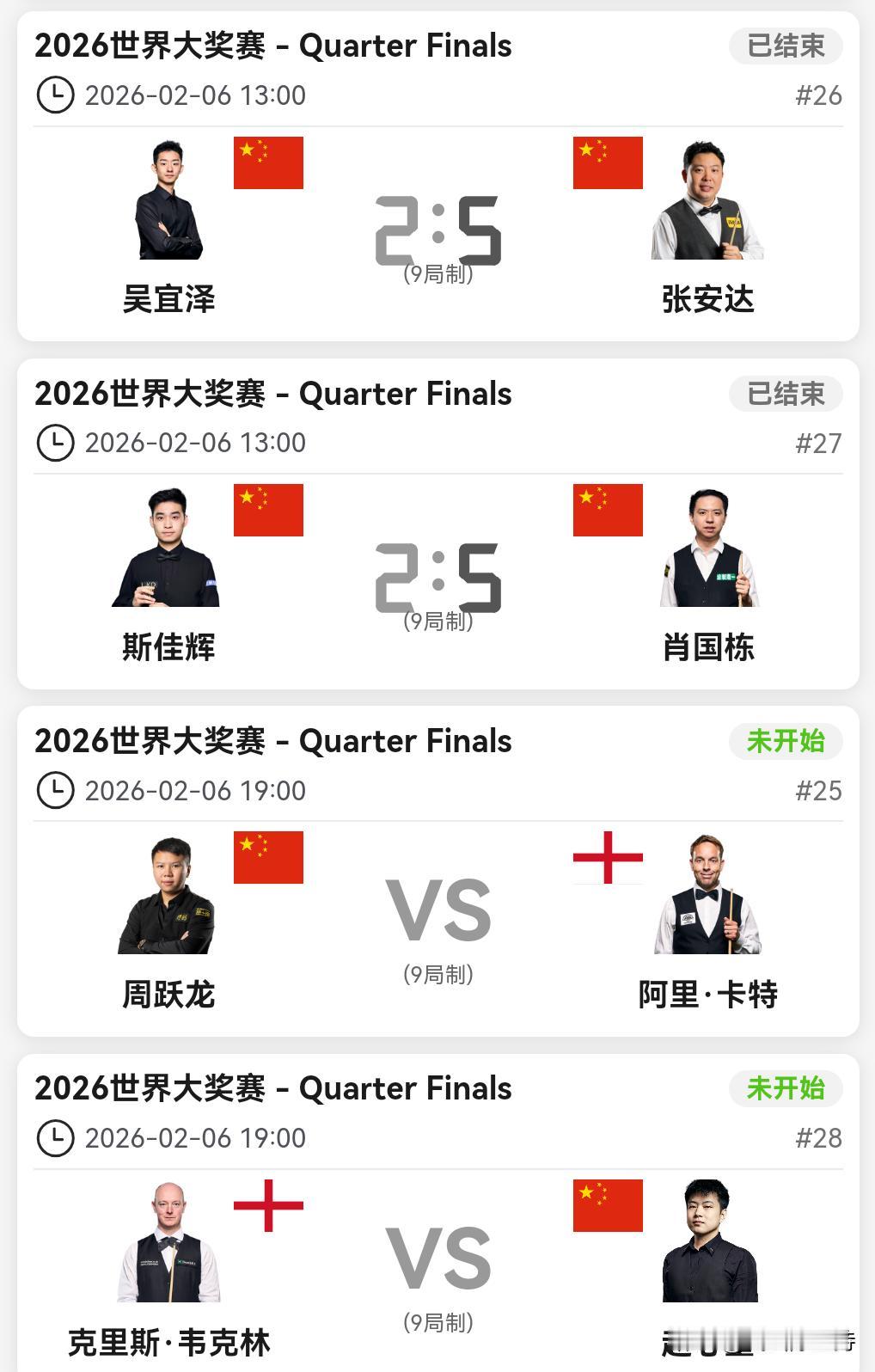 刚刚结束两场1/4决赛,肖国栋和张安达分别以5-2的比分击败斯佳辉和吴宜泽。 肖国栋和斯佳辉一战,第一局肖国栋中袋失误,斯佳辉单杆78拿下。第二局,斯佳辉连打带K,白球摔袋,肖国栋单杆72分拿下。第三局,肖国栋长台上手,单杆97分拿下。打出4连鞭,率先拿下赛点。 斯佳辉利用肖国栋防守失误,扳回一局。最终肖国栋拿下比赛。 整体而言,肖国栋处理球形的能力非常强,不管什么样的球形,都能弄个七十分之上,这样斯佳辉的压力非常大。斯佳辉在防守和围球方面都逊色一些,夺冠还为时尚早。 肖国栋一路击败凯伦威尔逊、奥沙利文和斯佳辉三位前16选手,体现了相当的战斗力。 张安达凭借准度围球和防守,击退了吴宜泽。 张安达一路战胜了威廉姆斯、霍金斯和吴宜泽三位前16选手,现在自己的状态也很不错。 晚上两场至关重要,能见证中国选手包揽4强的场景吗? 赵心童对阵韦克林 周跃龙对阵卡特