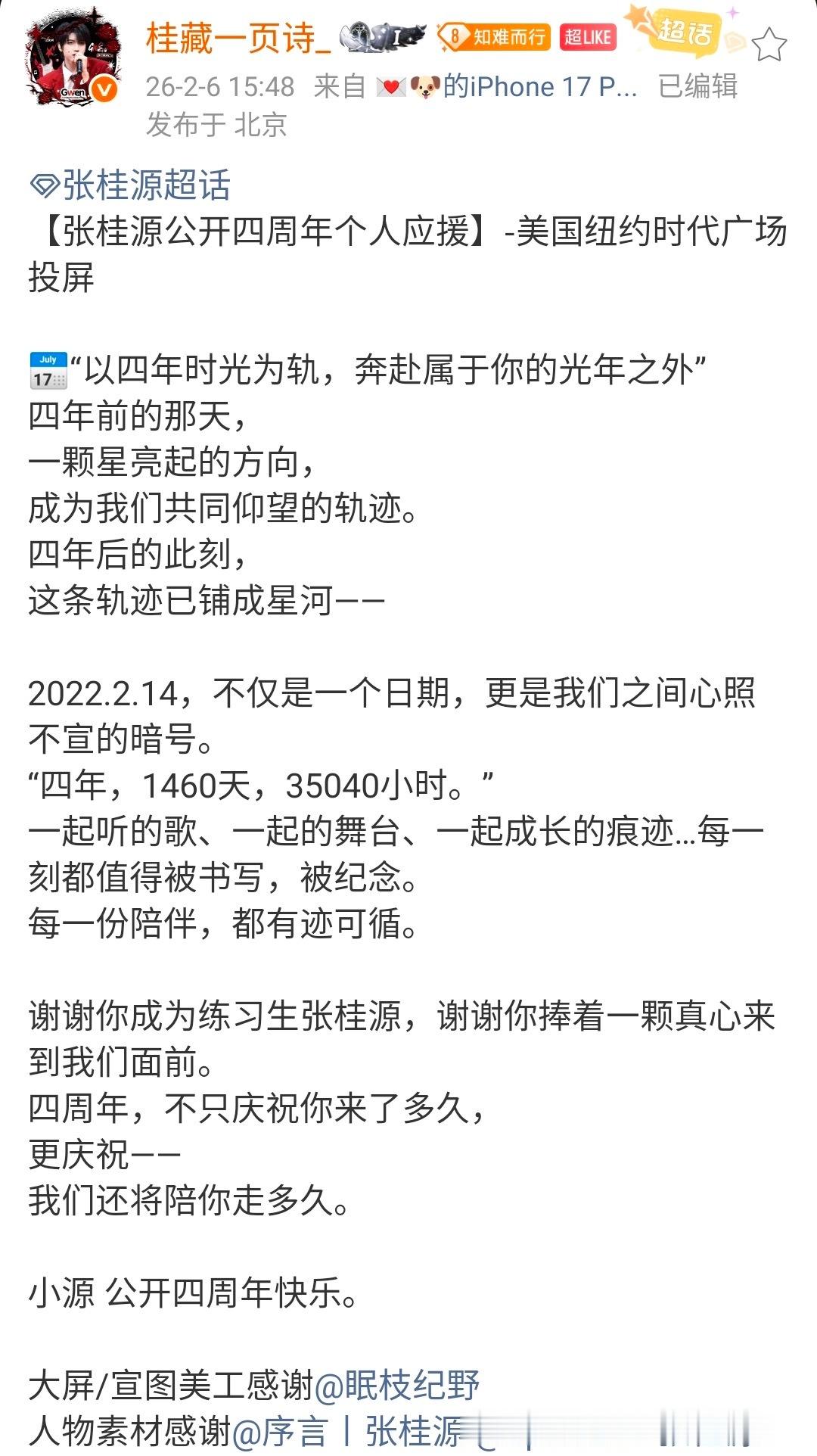 张桂源纽约时代广场应援 张桂源公开四周年纽约时代广场大屏应援还是个人应援,投放时间2.14日