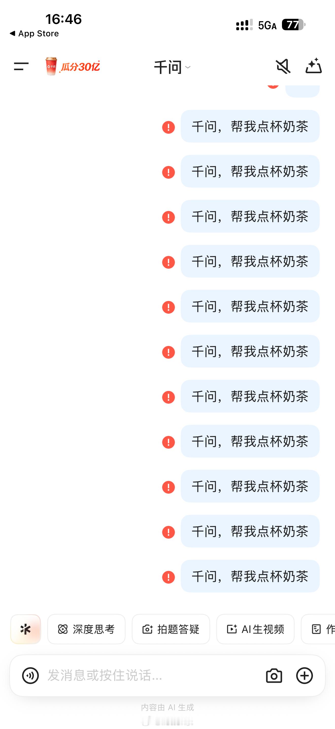 千问让奶茶店爆单了我大概点了1个小时,奶茶送上门了,确实很多人点,服务器都有点