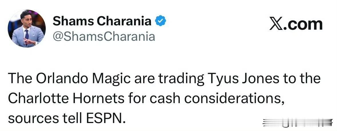 独行侠交易得到心仪后卫泰厄斯-琼斯!!! 根据记者Shams最新消息透露,夏洛特黄蜂队将后卫泰厄斯-琼斯交易至独行侠队,换来马拉基-布兰汉姆。 在浓眉的交易中,后卫拉塞尔也一起去了奇才,独行侠缺少后卫,如今他们得到了一直心心念念的后卫泰厄斯-琼斯,要知道当年独行侠选择拉塞尔也是迫不得已,其实他们想签下的就是泰厄斯-琼斯,如今双方总算团聚了。 泰厄斯-琼斯也是在截止日前被连续交易,先是被魔术送到了黄蜂,他们此举也是为了省钱,紧接着在今天凌晨,黄蜂又将他送到了达拉斯,毕竟黄蜂后卫也很多,他们也愿意送走琼斯。 独行侠今天也发表声明他们不会交易欧文,那么欧文健康后他首发,琼斯替补也是不错的搭档。欧文 浓眉 独行侠 黄蜂 魔术 NBA独行侠 NBA 独行侠
