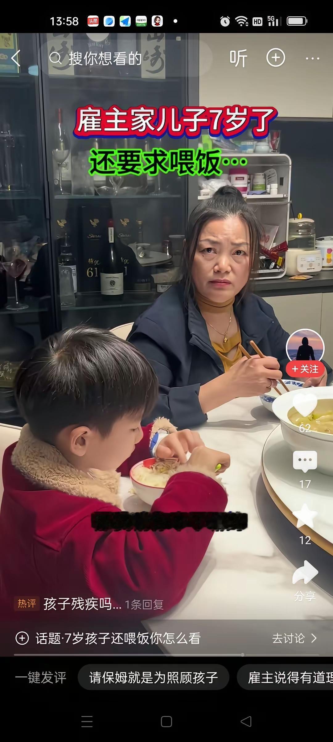 俺不会喂? 得儿:干了这么多年的保姆,没喂过七岁的孩子,咱不是一路人,拜拜了,您嘞! 哈哈哈:真是挺奇葩!七岁的儿子还需要人喂,保姆呢?偏偏看不惯这种行为,就是不喂,就这样解除合同,一拍两散,一个用不起,一个还不愿意伺候,有意思吧? 是保姆的正直,刚正不阿,还是女主人的娇生惯养,一宠百宠,把孩子养成了“巨婴”? 支持保姆的不在少数吧?这就是认知,教育孩子的根本,过分溺爱就是害,七岁了啊!还要雇保姆喂,太过分了吧!