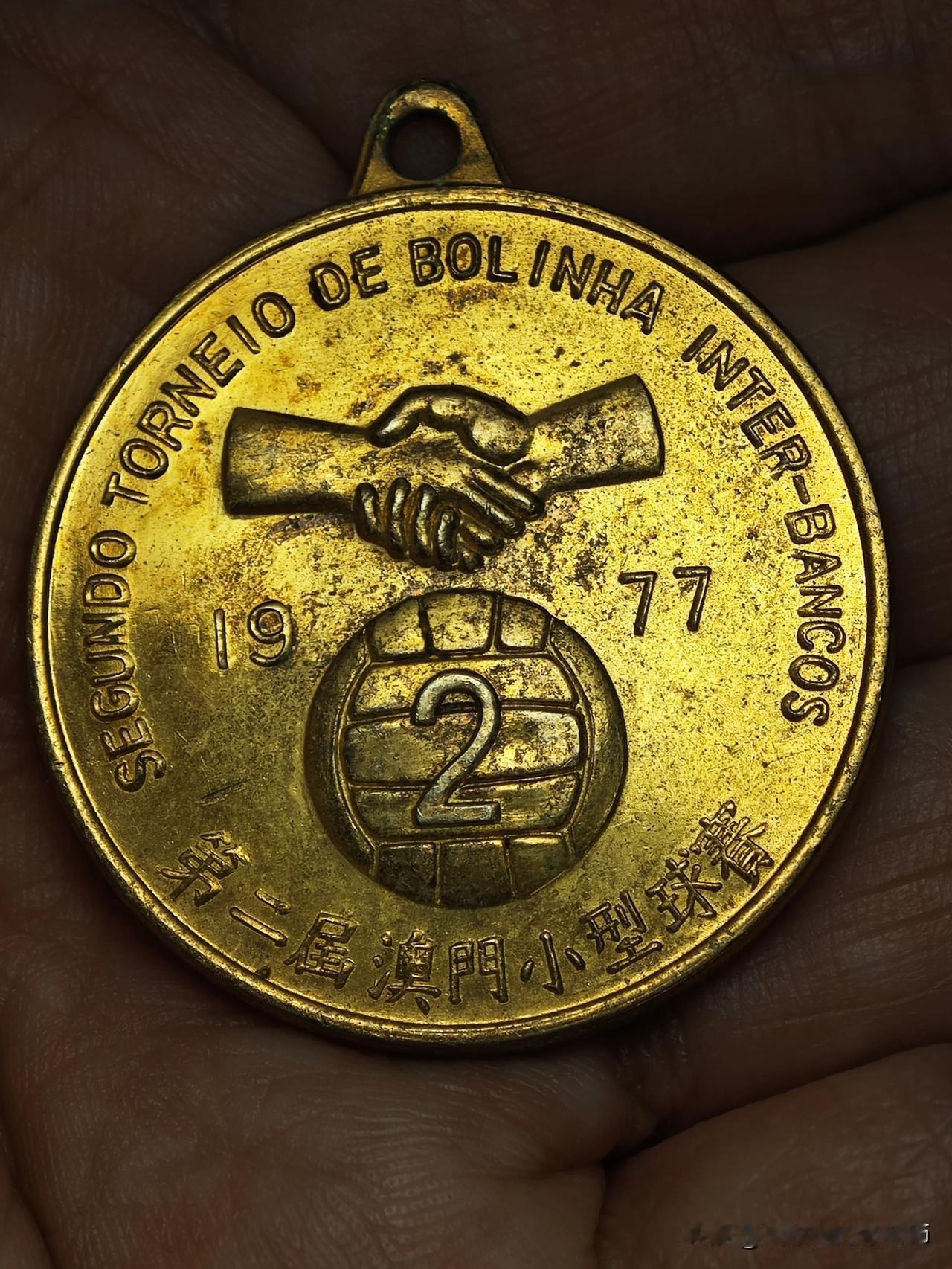 这枚是1977年第二届澳门小型球赛鎏金纪念章,属于澳门银行业联合举办的职工运动会赛事奖章,是体育类收藏与港澳地方史收藏的珍贵实物。奖章为铜质鎏金工艺,正面是足球运动浮雕,背面中西双语标注赛事信息,搭配握手、足球与第二名纹饰,整体鎏金留存完整,包浆温润,品相上佳。上世纪70年代澳门金融行业文体活动盛行,银行界联合办赛是当时社会风貌的真实体现,此类行业体育奖章存世量稀少,好品更为难得,兼具体育竞技、金融行业、澳门近代社会史料三重收藏价值,是小众冷门却极具年代意义的港澳老徽章藏品。
