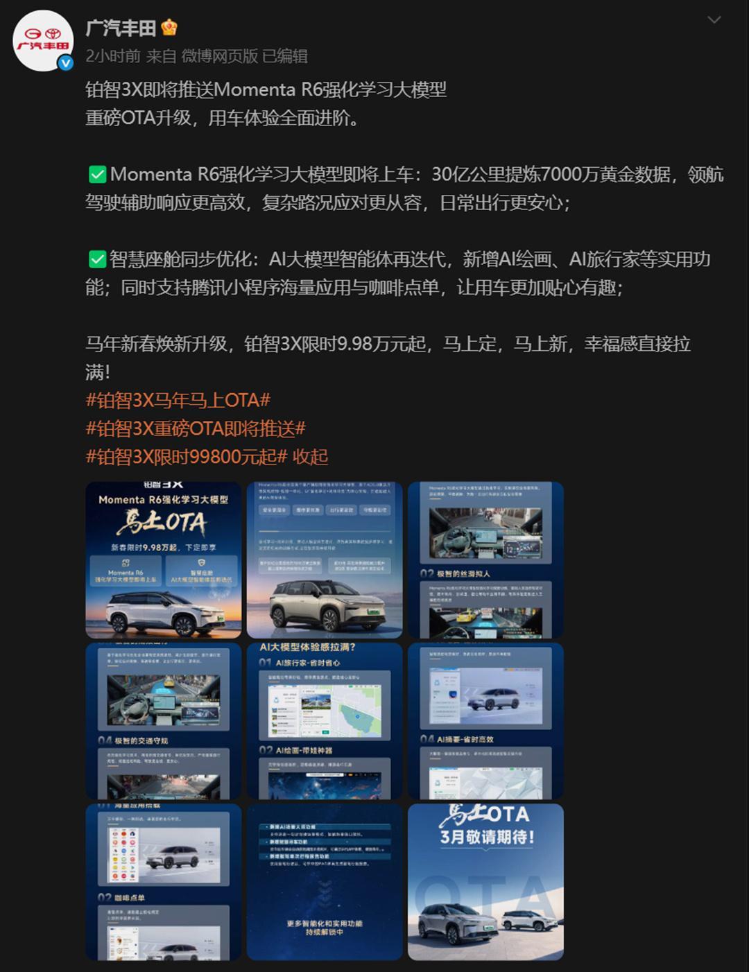 之前已被不少小伙伴盯上的“Momenta R6强化学习大模型”OTA,这次有盼头了!目前已确定,铂智3X将于3月18日将迎来新一轮OTA升级,Momenta R6强化学习大模型上车之后的智能驾驶辅助将会更加好用。毕竟是从30亿公里中提炼7000万珍贵数据,针对领航驾驶辅助方面的体验提升应该会非常明显。与此同时,铂智3X已符合现有已实施的全部安全标准,在三电、智驾等方面均具备充足的安全冗余,安全这块应该没得说。铂智3X重磅OTA即将推送