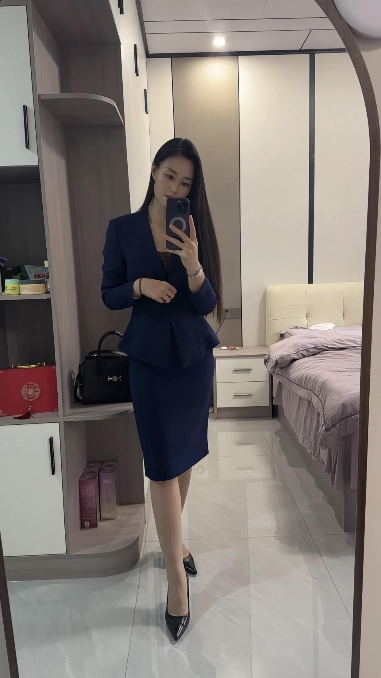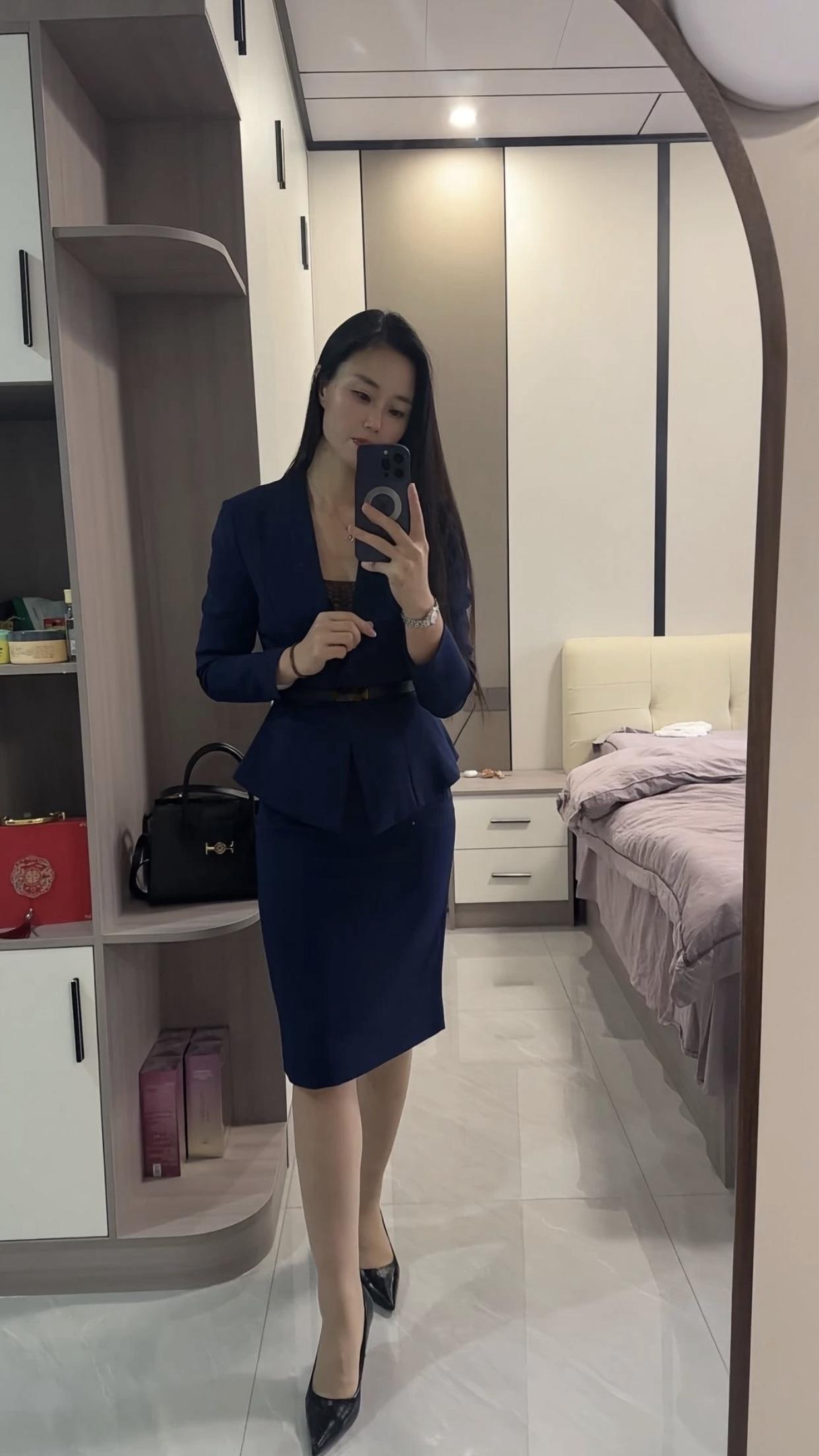 优雅职场穿搭,蓝色西装裙搭配高跟鞋,自信满满!