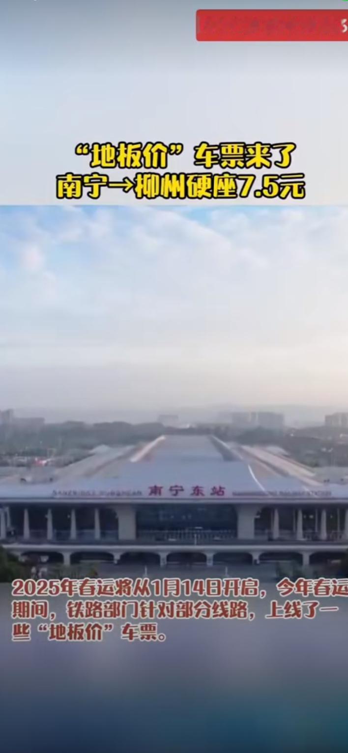 春运奇观!南宁到柳州仅7.5元,比公交还便宜的返乡票藏着这些惊喜 春运车票动辄百元起步?这趟列车偏要打破常规!2月2日清晨,K4236次春运临客从南宁站缓缓驶出,一张南宁至柳州的7.5元硬座票刷爆社交平台,让网友惊呼“春运还有这种神仙票价”。 要知道,南宁到柳州的常规交通成本可不低:动车二等座最低83元,大巴票价约70元,即便是普通快速列车硬座也需32.5元。而这趟临客的票价直接“腰斩再腰斩”,7.5元仅够买一瓶饮料,却能搭载旅客穿越250公里返乡路,历时3小时16分钟直达柳州。更惊喜的是,延伸线路同样惠民,南宁至桂林北仅12.5元,跨省到杭州也才42元,比同期普速列车省百元以上。 低价绝非服务打折的借口。这趟25G型空调列车全程供应24小时热水,餐车热食不断,列车员主动帮务工者搬运行李、为带娃家庭答疑解惑,服务标准与图定列车别无二致。“平时坐大巴要70元,现在省的钱能给家人买年货”,柳州籍学生徐先生攥着车票的笑容,道出了旅客的心声。 不过这样的“白菜价”车票并非随时可抢。列车仅在2月2日至12日开行,12306平台标注“折”字标识,硬座票紧俏无座票相对充足,且仅南宁往柳州方向优惠,反向暂无此低价。随着春运返乡潮升温,这趟客座率飙升的临客已成为务工族与学生党的“香饽饽”。 在一票难求的春运季,7.5元的返乡票不仅是铁路部门盘活运力的巧思,更是民生温度的体现。想要薅到这份春运福利,可得抓紧时间登录12306刷新余票,毕竟这样的性价比奇迹,错过可就要等明年了!