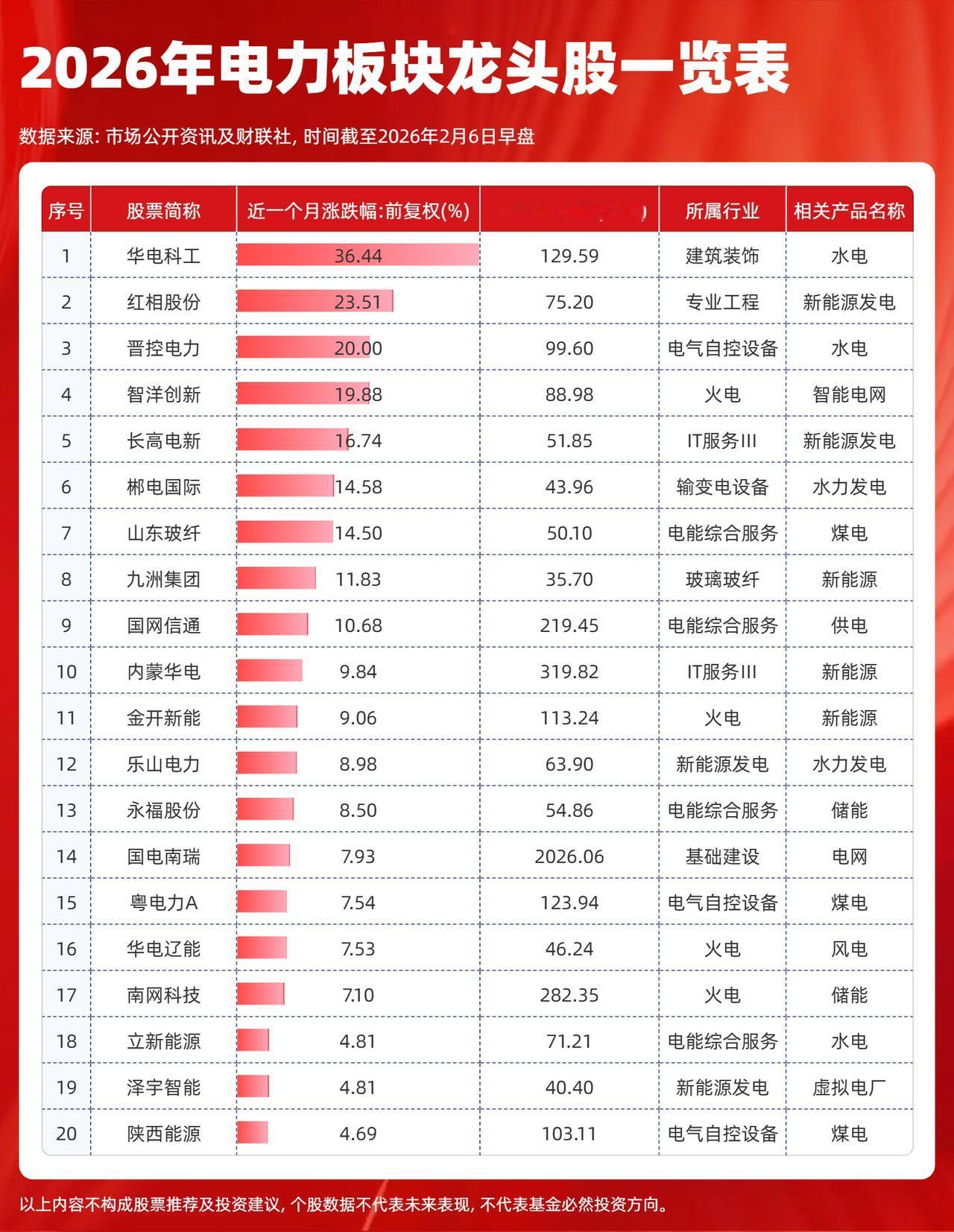 电力板块龙头股一览表(2026年最新) (向右滑动图片查看完整名单) 近期,风电光伏企业陆续完成2025年业绩预告披露。对此,华泰证券重申风电光伏板块盈利修复趋势,认为太空光伏领域或打造新业态,风电企业有望受益。 与此同时,年景预测2026年全球“风光水”发电能力有望提高;叠加技术突破消息催化,电力板块龙头股颇受市场关注。 电力板块最新行情 1、2025年业绩表现:风电光伏板块整体承压 华泰证券指出,受国内低价陆风项目集中交付影响,风机公司盈利能力阶段性走弱;银价上涨提供电池组件成本上升,导致光伏企业亏损面有所扩大。 2、机构展望2026年:盈利修复、多元增量可期 华泰证券重申风电光伏板块盈利修复趋势,认为风机订单价格自2024年四季度持续回暖,涨价订单逐步交付,将会支撑盈利改善; 光伏供应链将会强化质量与成本把控,叠加高功率产品迭代、贱金属替代方案落地,从而驱动盈利修复。 气象机构预测,同步支撑电力板块向好趋势。预计2026年全球风电、光伏及水电发电能力将全面提升,其中光伏发电能力预计增长约25%,风电增长约2%。 与此同时,SpaceX收购xAI后整合打造太空-地面-算力生态,光伏龙头凭借研发积累具备跨界优势,风电企业也有望通过前瞻布局受益。 3、核心技术突破:全球首台海上风电机成功发电 全球首台20兆瓦海上风电机组成功发电,预计单台年发电量超8000万千瓦时,可满足约4.4万户家庭年用电需求,为深远海风电规模化开发奠定基础。