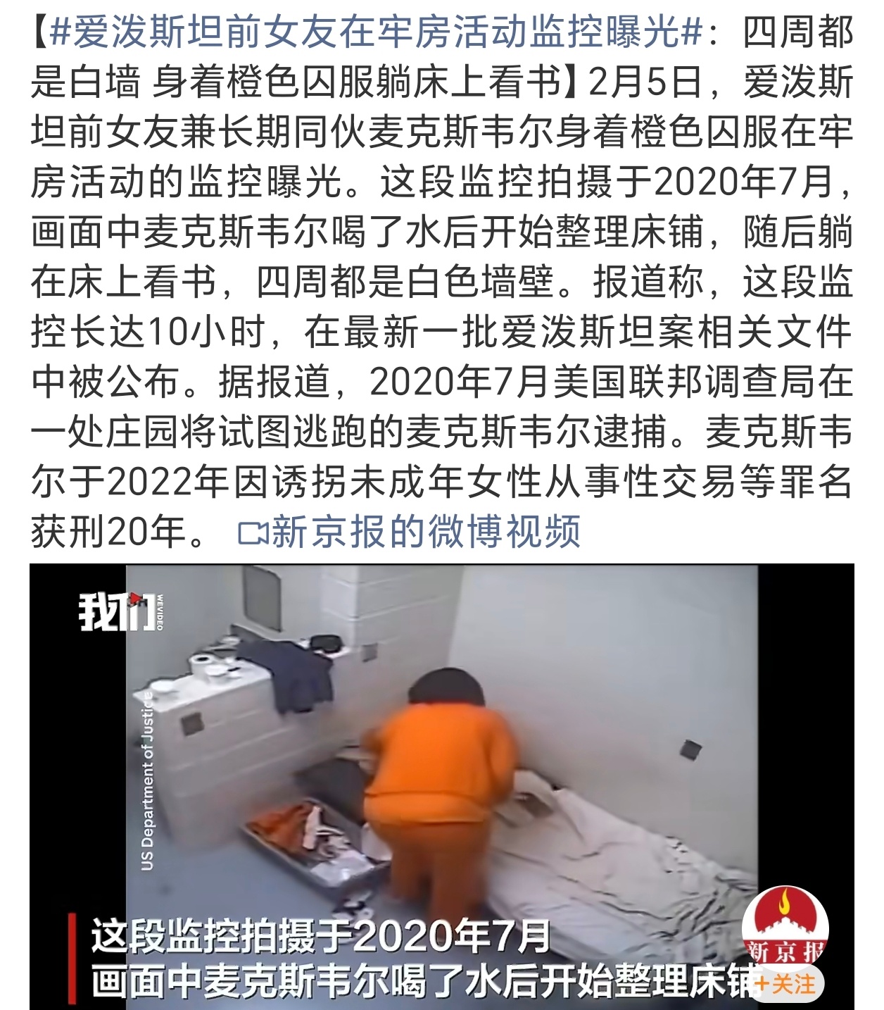 爱泼斯坦前女友在牢房活动监控曝光继续深挖,把这些老匹夫的恶劣事件全部曝光,让大家